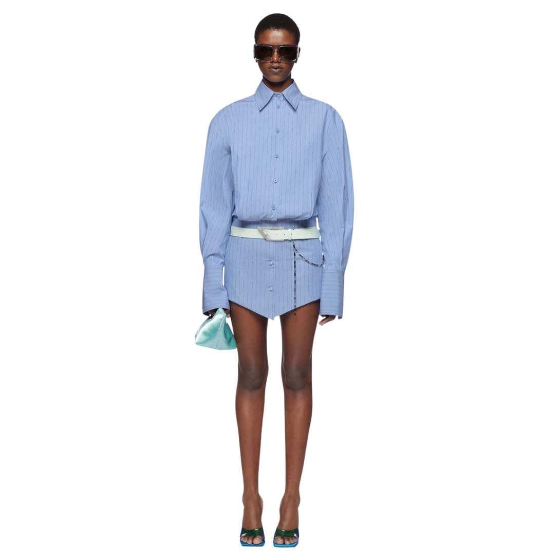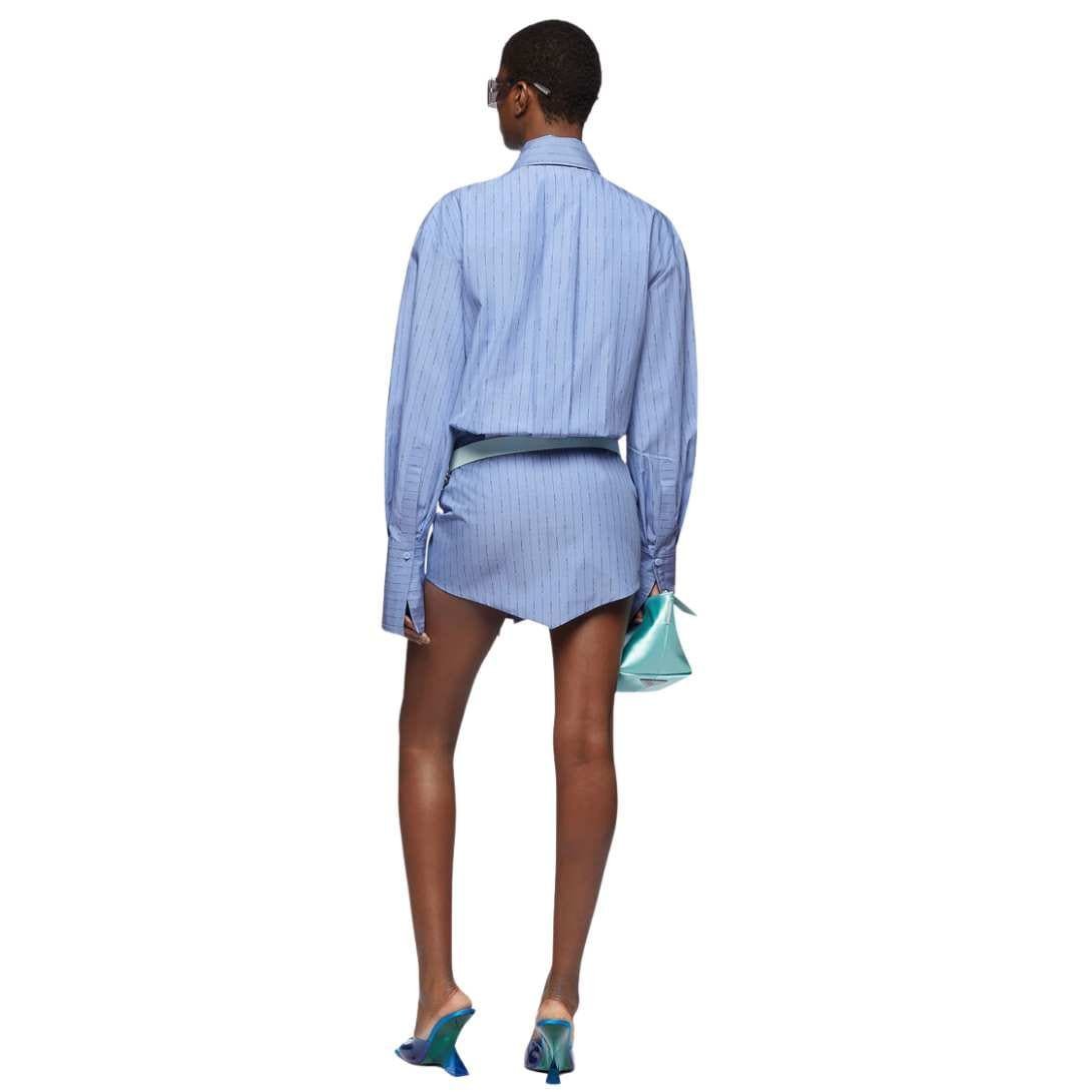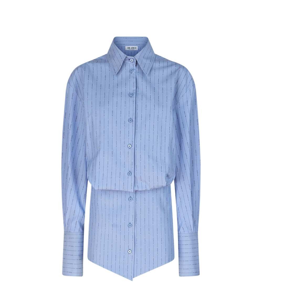 The attico silvye navy blue and sky mini dress, crafted in Italy, features a navy blue and sky striped logo cotton jacquard. It boasts a fitted basque for a chic silhouette.