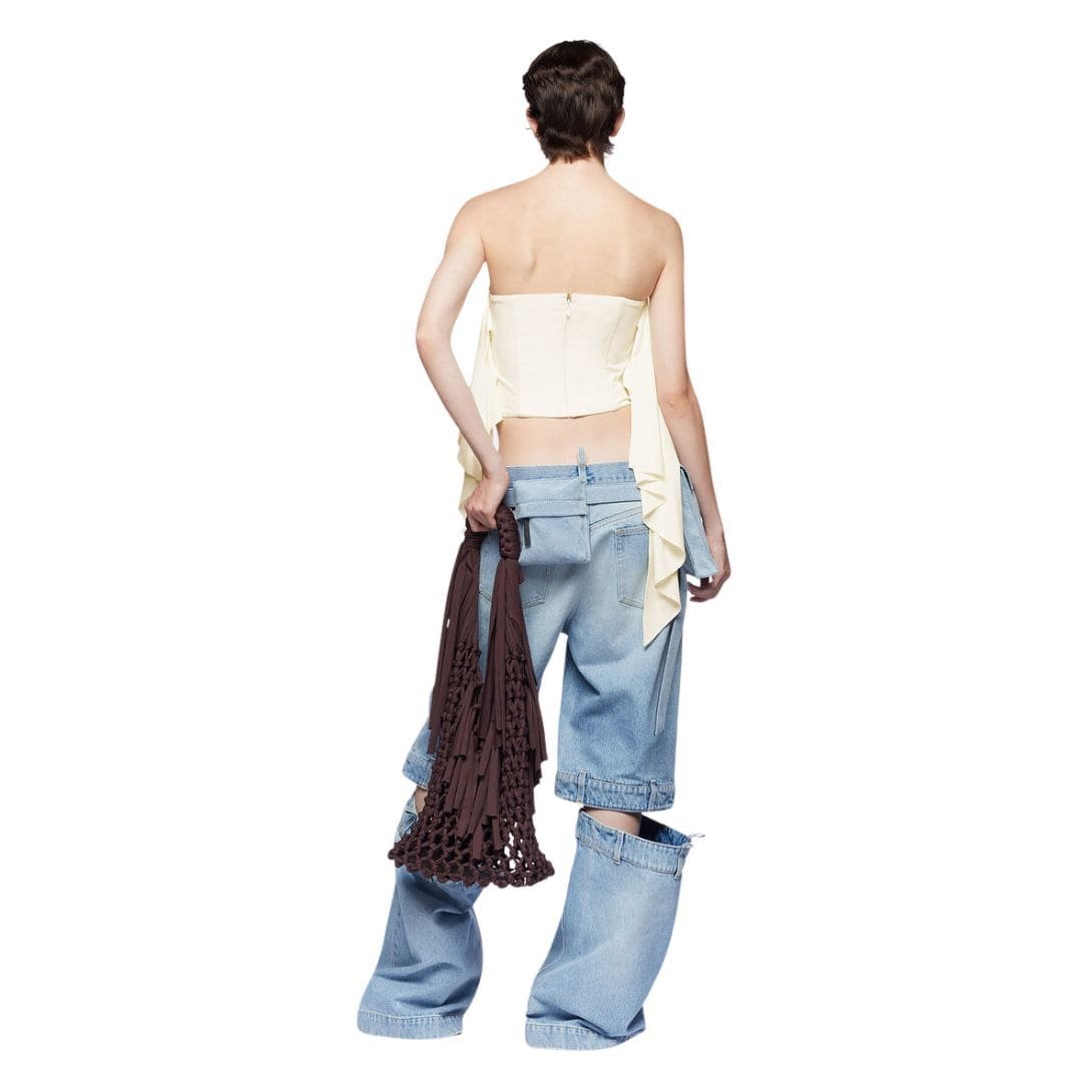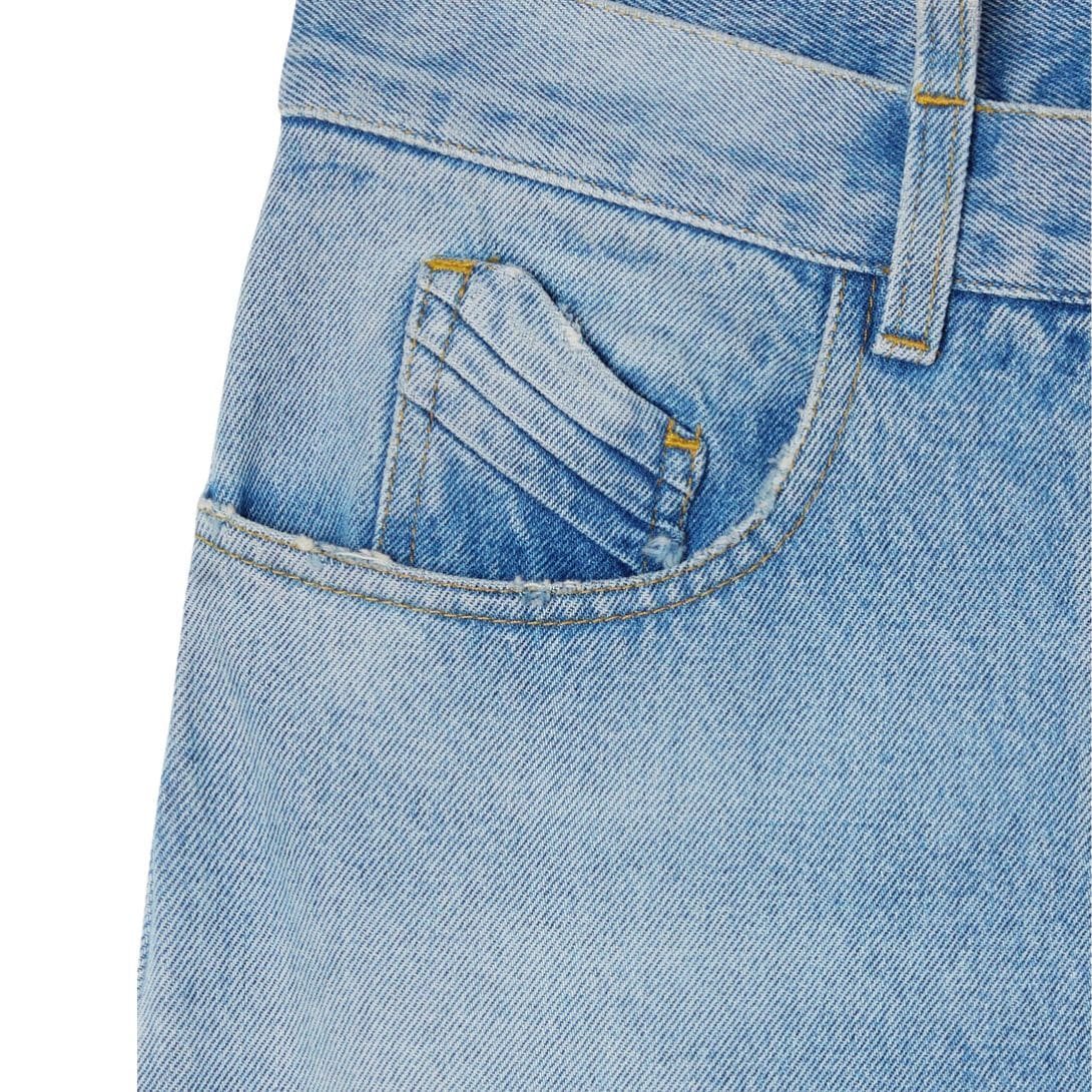 The attico sky blue long pants are crafted from sky blue denim and feature a cut-out on the back, a folded fifth pocket, and an embroidered logo. Made in Italy.
