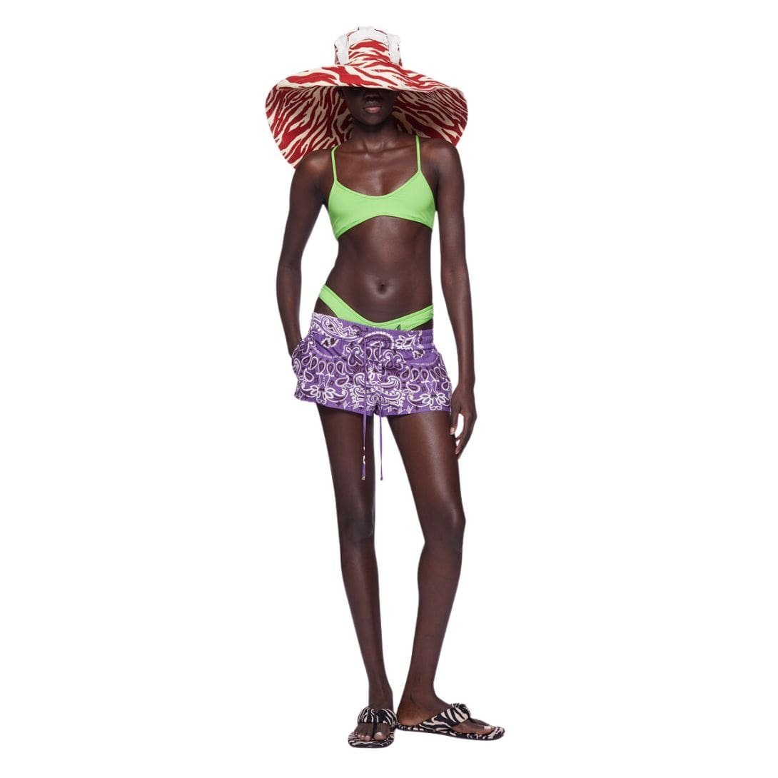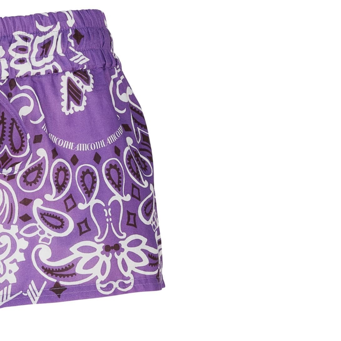 The Attico Violet, Brown and White Short pants features a striking bandana print in violet, brown, and white, with a stylish shaped split. Made in Italy.