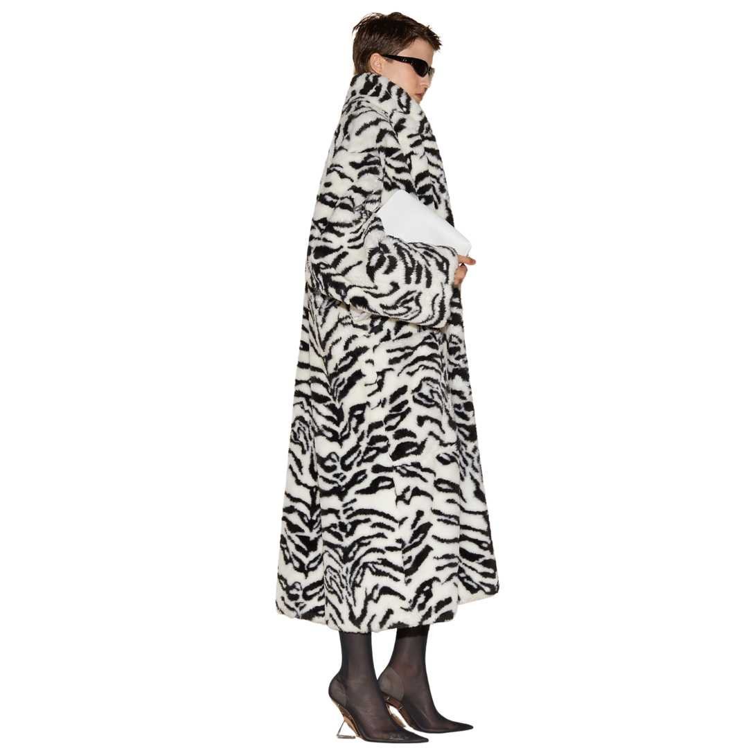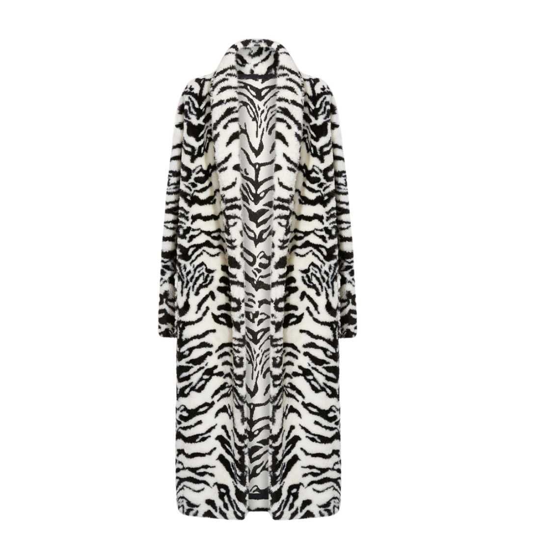 The attico white and black long fur coat features a striking white and black zebra print. Made in Romania.