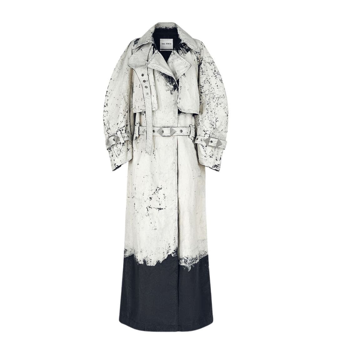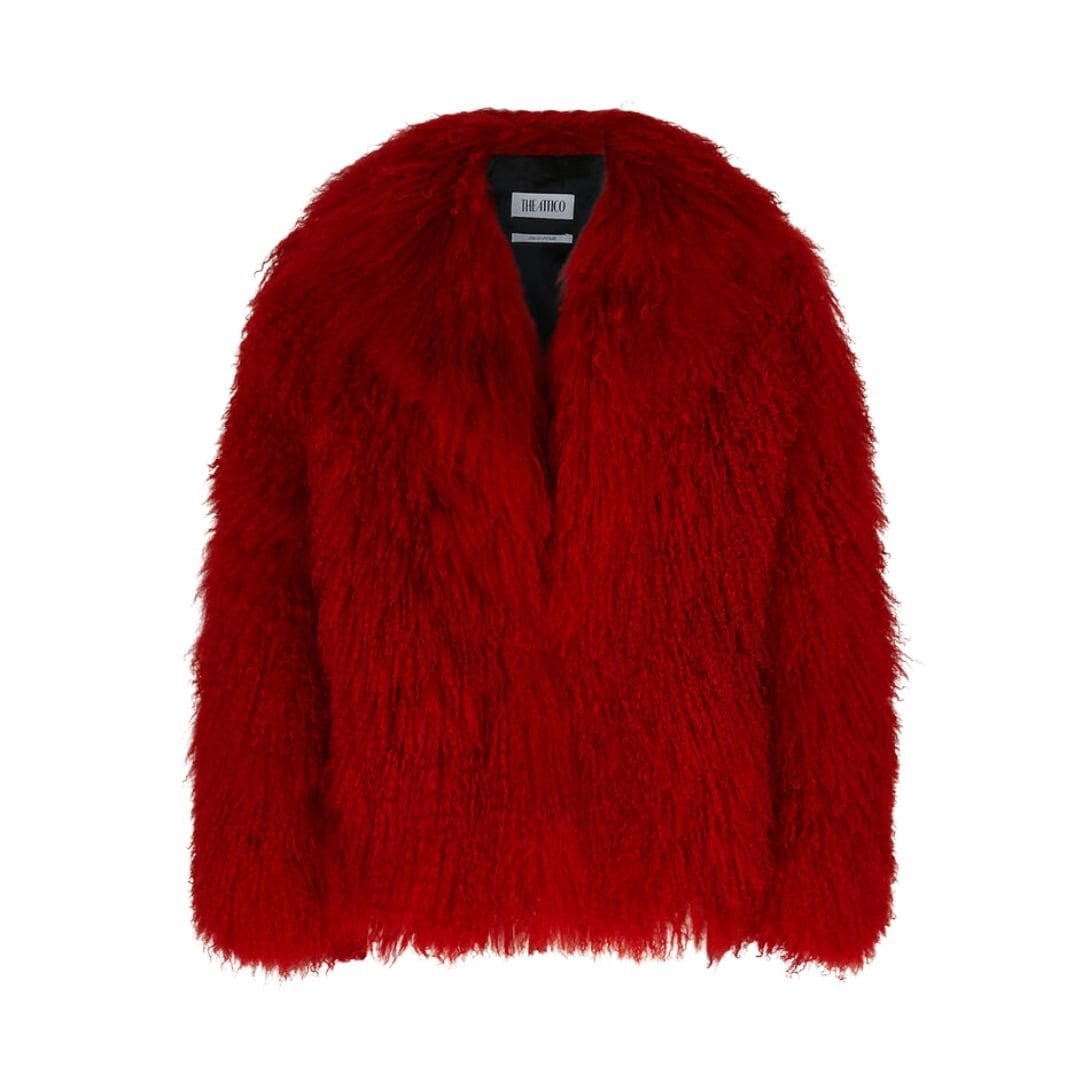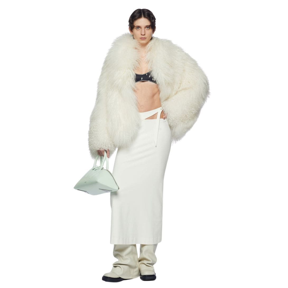 The attico white short coat in white Mongolian fur features wide lapels, a padded black jacquard logo lining, and logo metal hooks. Made in Italy.