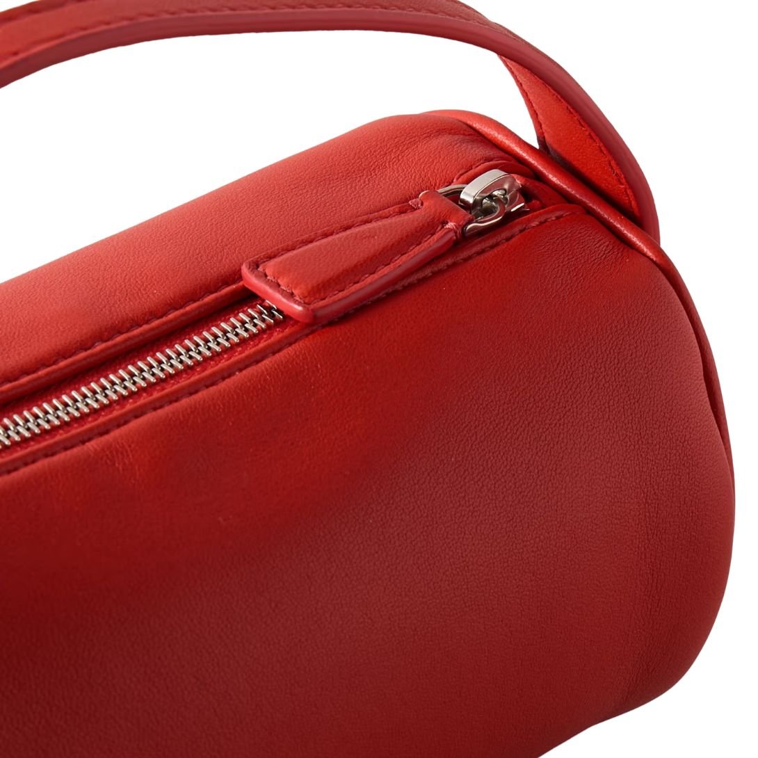 Crafted from supple red calf leather in a striking “Candy Red” shade, this tote stands out through its simplicity. Clean lines, a compact shape, and the absence of overt branding emphasize its quiet luxury. Though minimal in detailing, the quality of materials and construction speak volumes. The bold color injects energy into understated outfits, offering an elegant pop that remains timeless.
