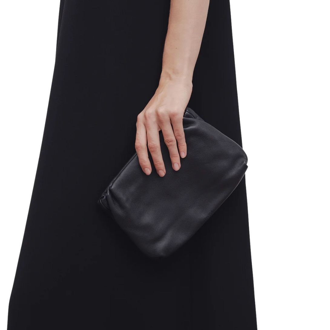 The Row’s Bourse Clutch is a refined statement of minimalist sophistication, merging soft structure with architectural detail. Crafted with the house’s signature restraint, this ruched clutch is designed to offer both visual texture and timeless elegance, effortlessly bridging day-to-night transitions with quiet luxury.