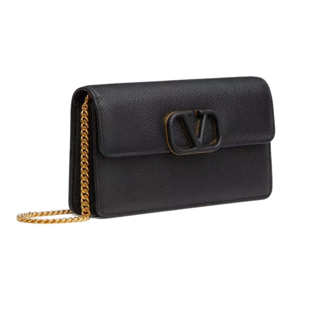 VALENTINO GARAVANI LEATHER WALLET ON CHAIN BLACK