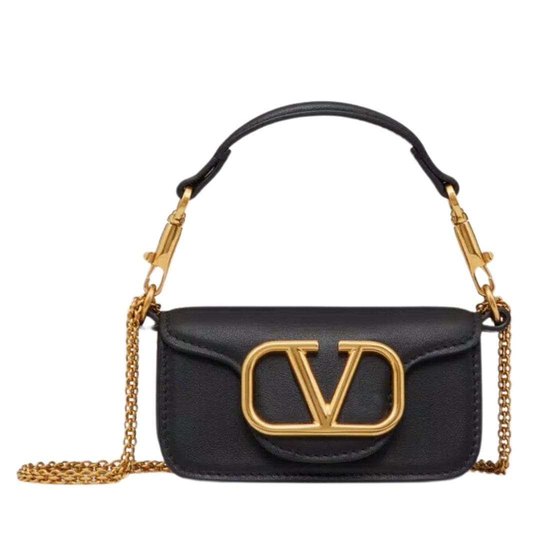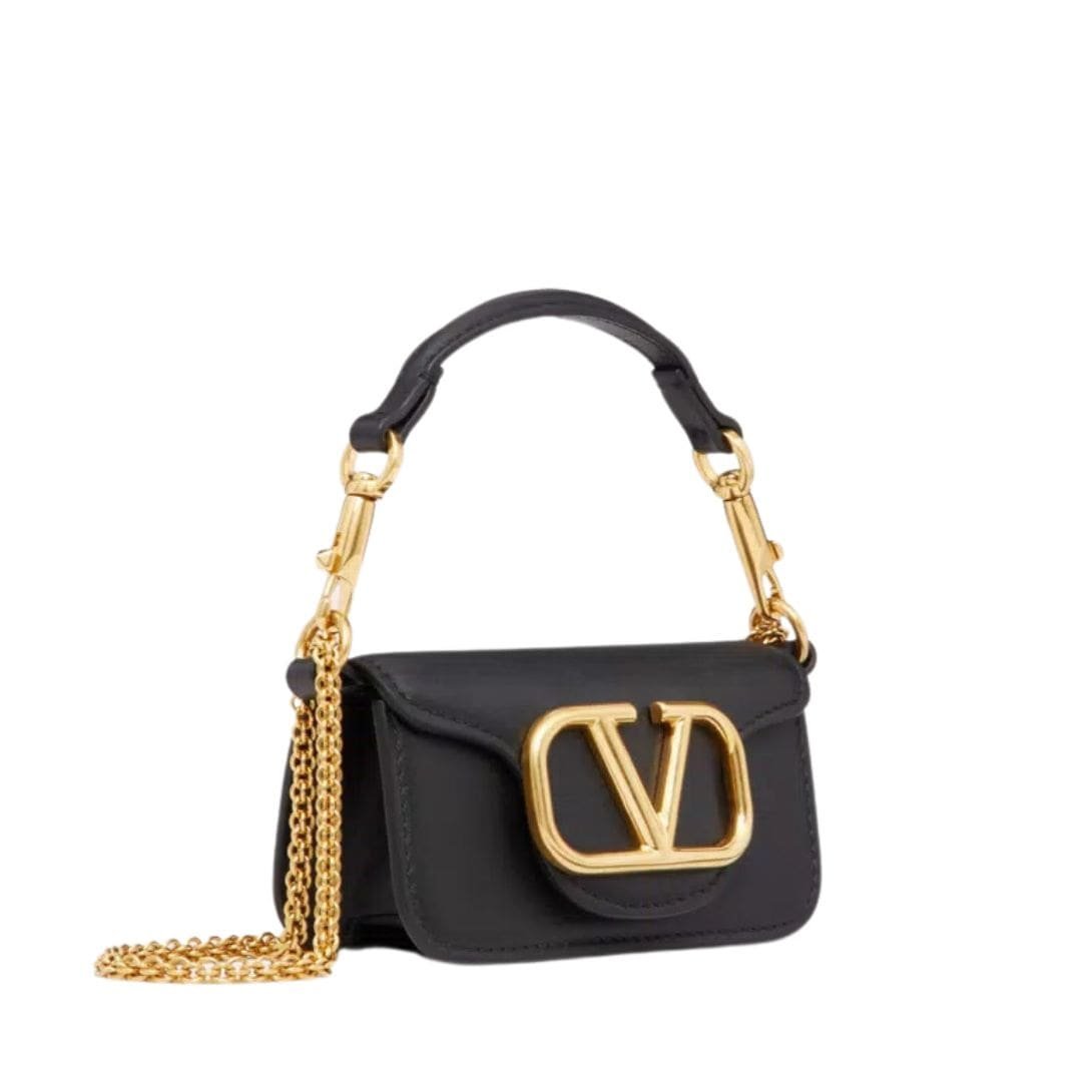 Introducing the Valentino Garavani Locò micro bag in calfskin leather with chain, adorned with the iconic VLogo Signature metallic element. This versatile accessory features antique brass finish hardware and a magnetic closure for added convenience.
