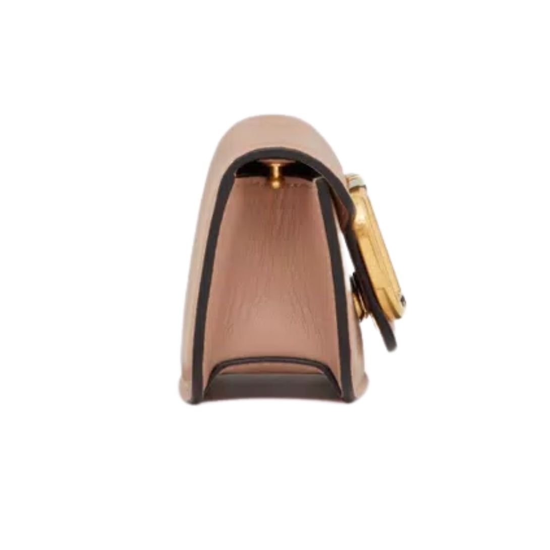Its versatile design features both a removable sliding chain strap and a detachable leather handle, allowing for multiple styling options: wear it as a crossbody, shoulder bag, or carry it as a mini handbag. Inside, a nappa leather lining and a dedicated card slot keep essentials organized within its compact silhouette.