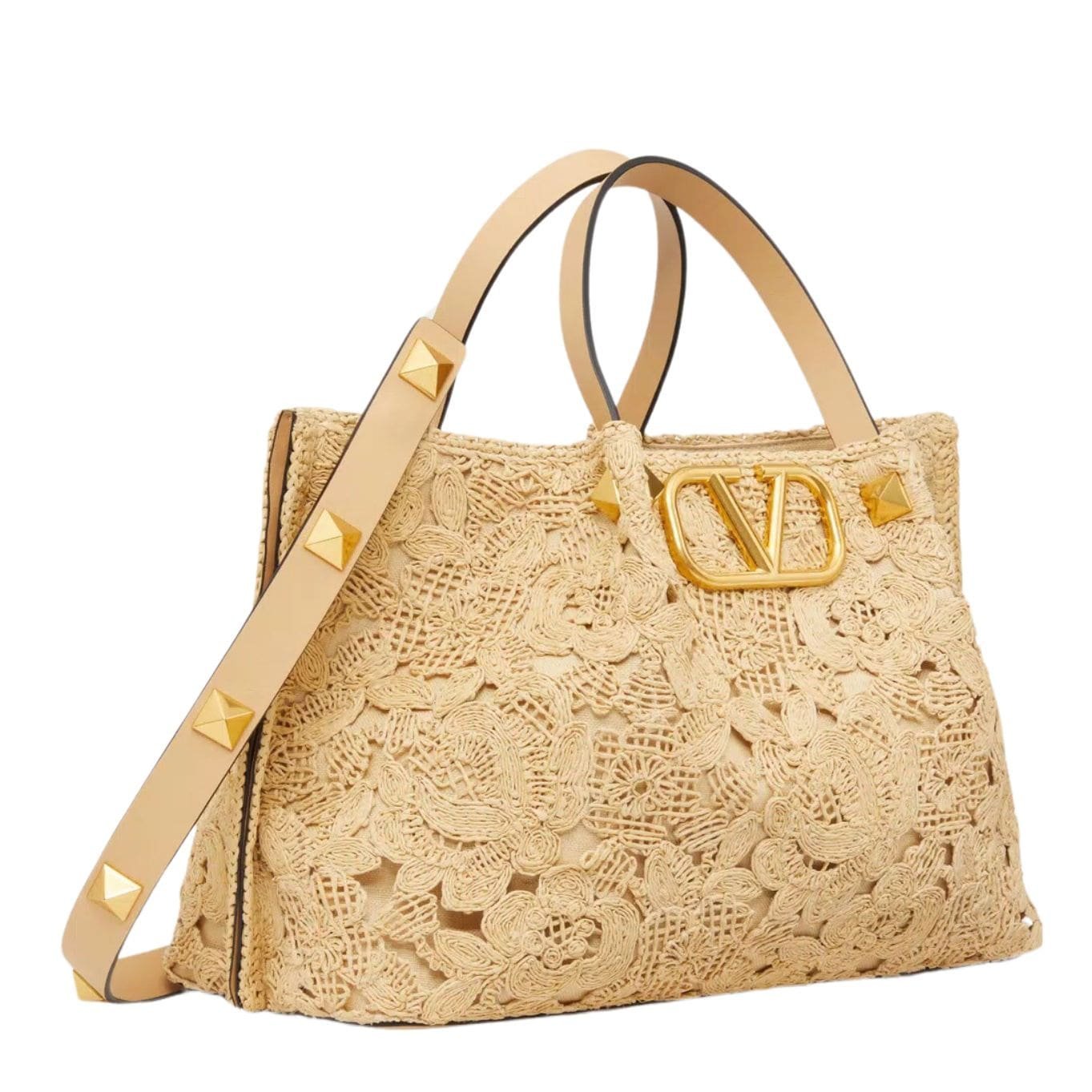 Introducing the Valentino Garavani Medium Shopping Bag in lace-effect raffia, crafted in synthetic lace-effect raffia, adorned with the iconic metal VLogo Signature and leather accents along the sides. Elevating its allure, the shoulder strap is embellished with the iconic maxi studs.