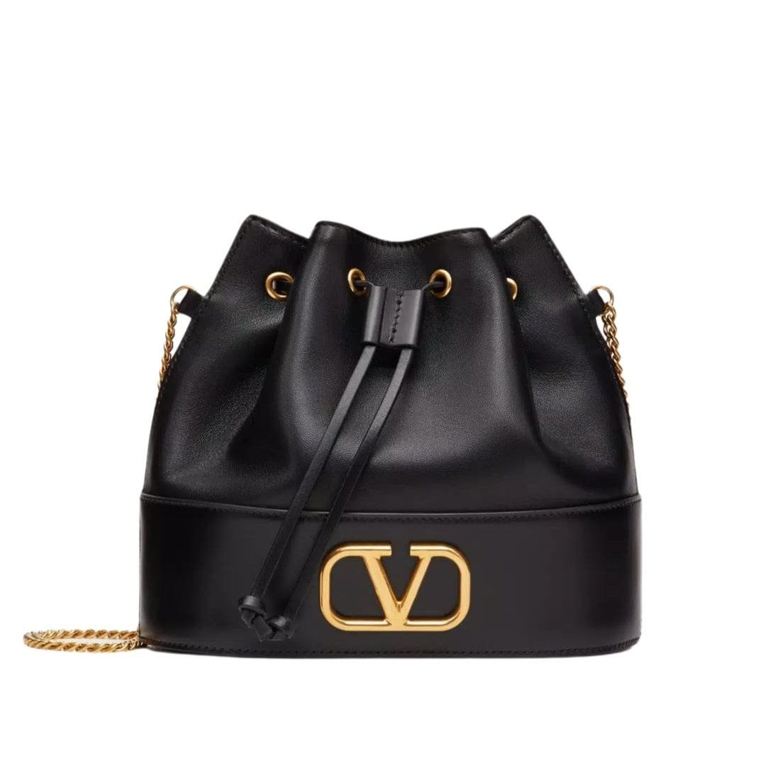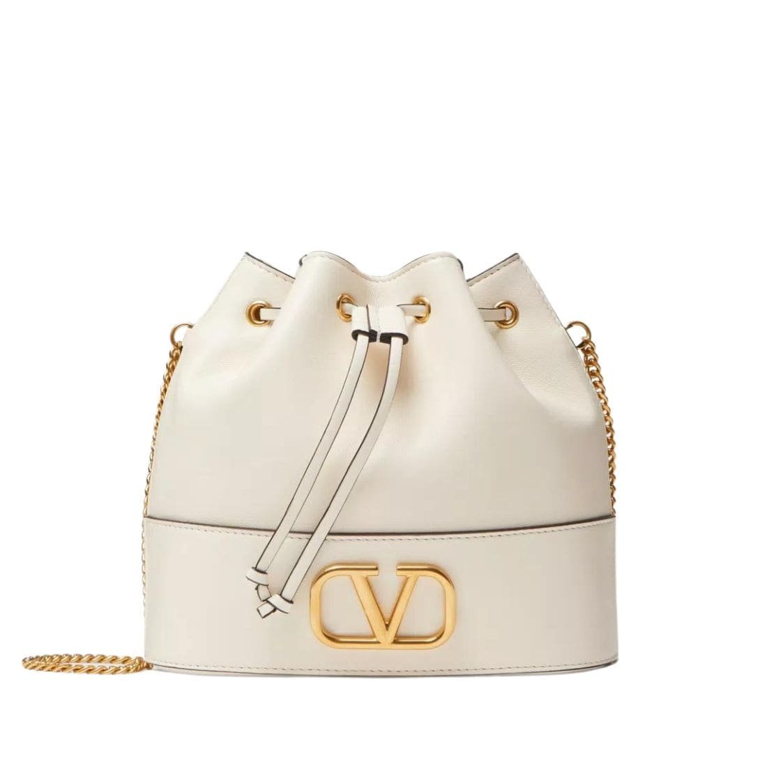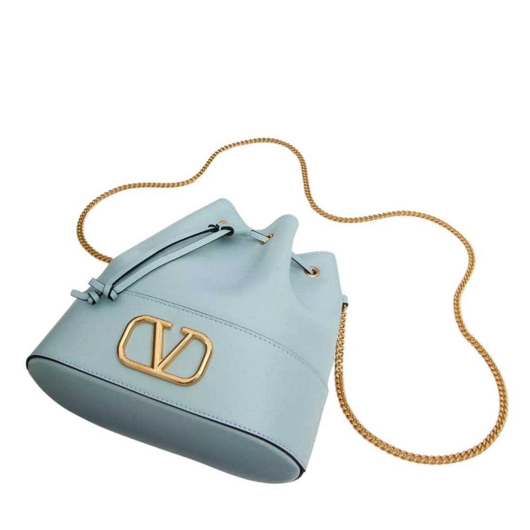 Introducing valentino garavani mini bucket bag in nappa with vlogo signature chain.