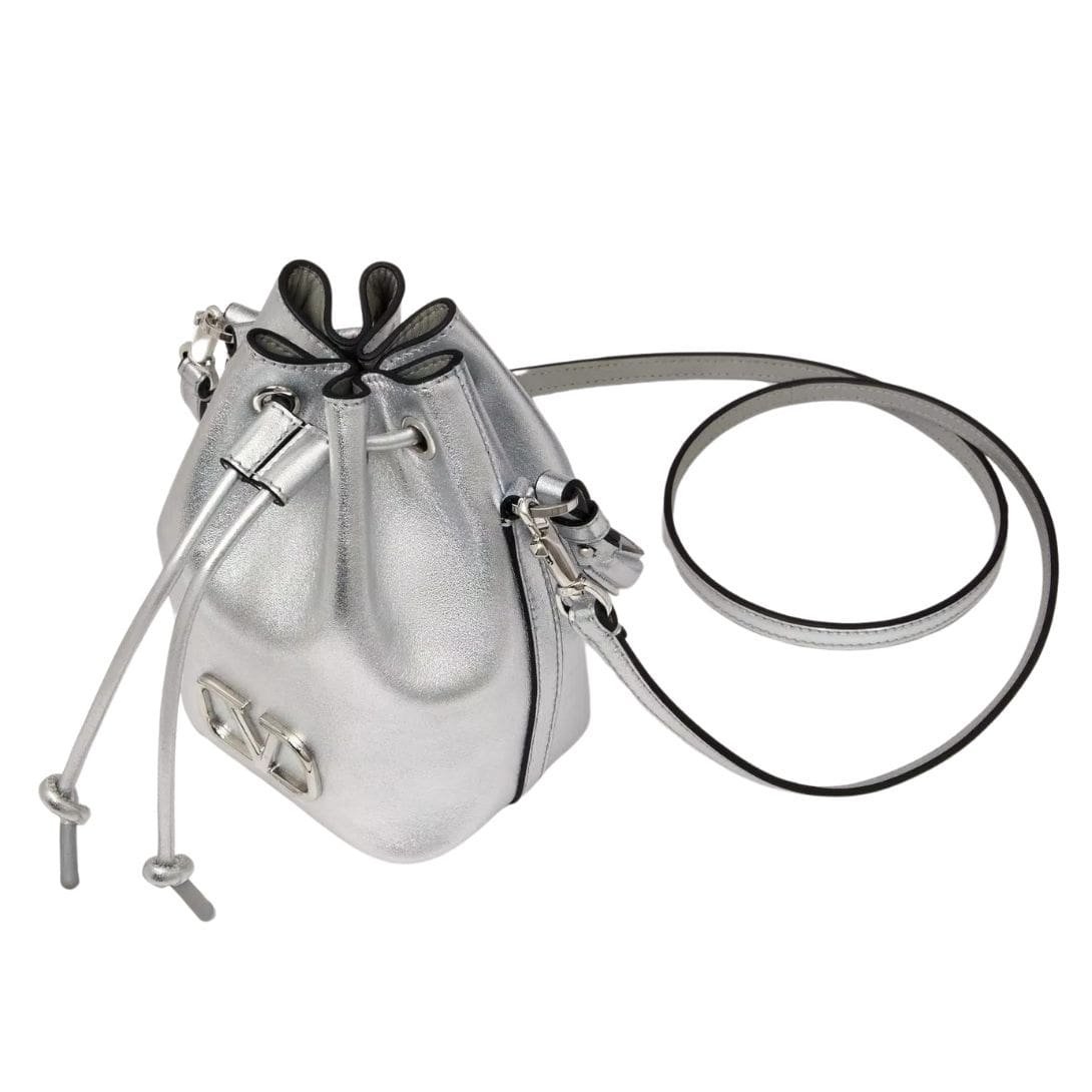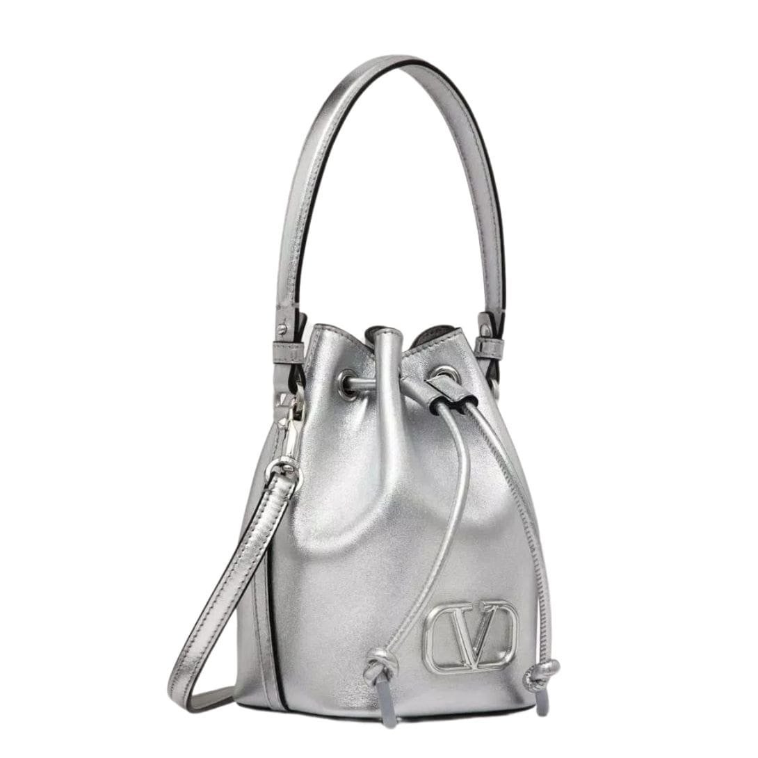 Introducing the Valentino Garavani mini VLogo Signature Bucket Bag in metallic nappa leather. This versatile piece offers multiple carrying options – wear it over the shoulder, across the body, or carry it by hand with its removable handle and shoulder strap.