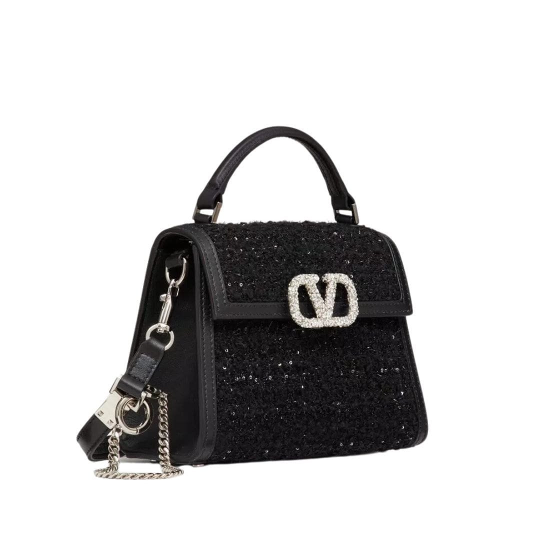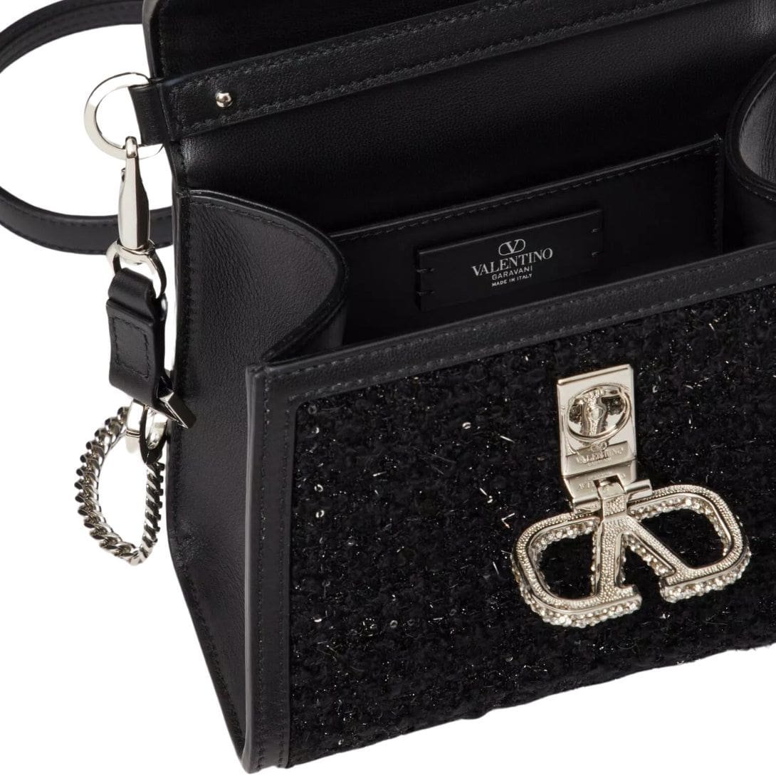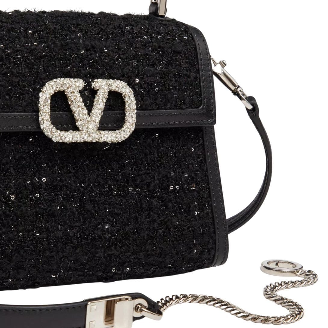 Introducing the enchanting Valentino Garavani mini Vsling tweed handbag, crafted from exquisite tweed embellished with delicate micro sequins and adorned with a captivating VLogo Signature closure encrusted with Swarovski crystals. This stunning piece offers versatility, allowing you to wear it effortlessly on the shoulder or crossbody with its extendable shoulder strap, or gracefully handheld with its chic handle.