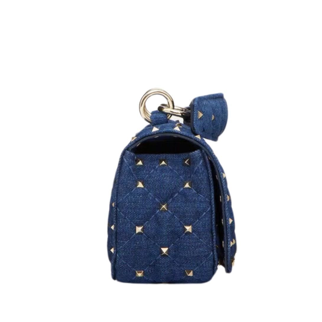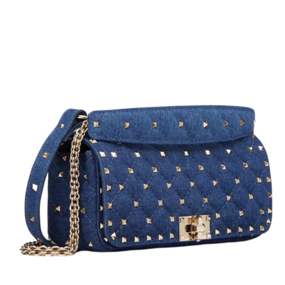 Introducing the Valentino Garavani Rockstud Spike denim shoulder bag with chain, featuring a quilted construction adorned with small studs for a touch of edge. This versatile bag comes with both a removable leather shoulder strap and a handle/chain, offering the option to wear it crossbody or handheld.