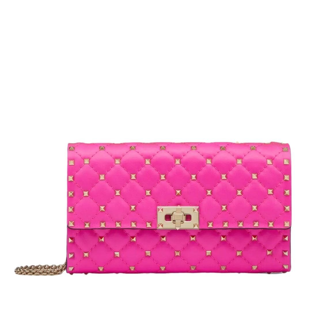 Introducing the Valentino Garavani Rockstud Spike nappa leather crossbody clutch bag, meticulously crafted from supple lambskin nappa leather with a quilted construction adorned with delicate studs. This versatile accessory features a detachable handle and chain strap, allowing it to be worn as a crossbody/shoulder bag or carried by hand.