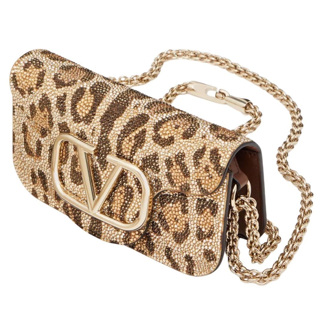 The Valentino Garavani Locò small shoulder bag boasts a captivating Animalier pattern rhinestone appliqué, paired with the iconic VLogo Signature metallic element, epitomizing luxurious sophistication.