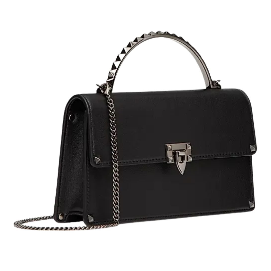 The standout studded metal handle and iconic Rockstud hook closure showcase Valentino’s signature style, combining structure with high-fashion edge. The interior includes three card slots, offering essential organization without bulk.