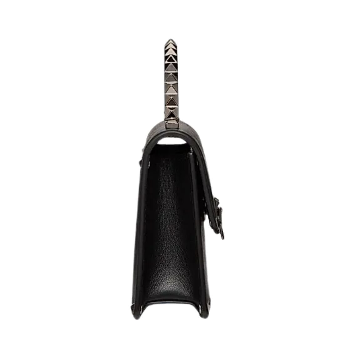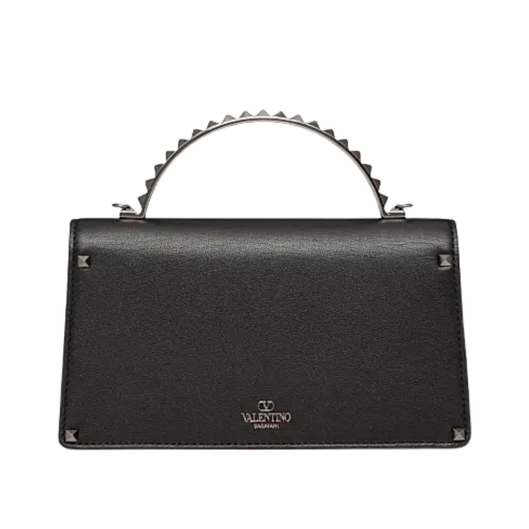Expertly crafted in Italy from luxurious calfskin leather, this mini handbag features a nappa leather lining for a smooth, premium interior. The tone-on-tone Rockstud hardware and metal handle provide a sleek, monochromatic finish.