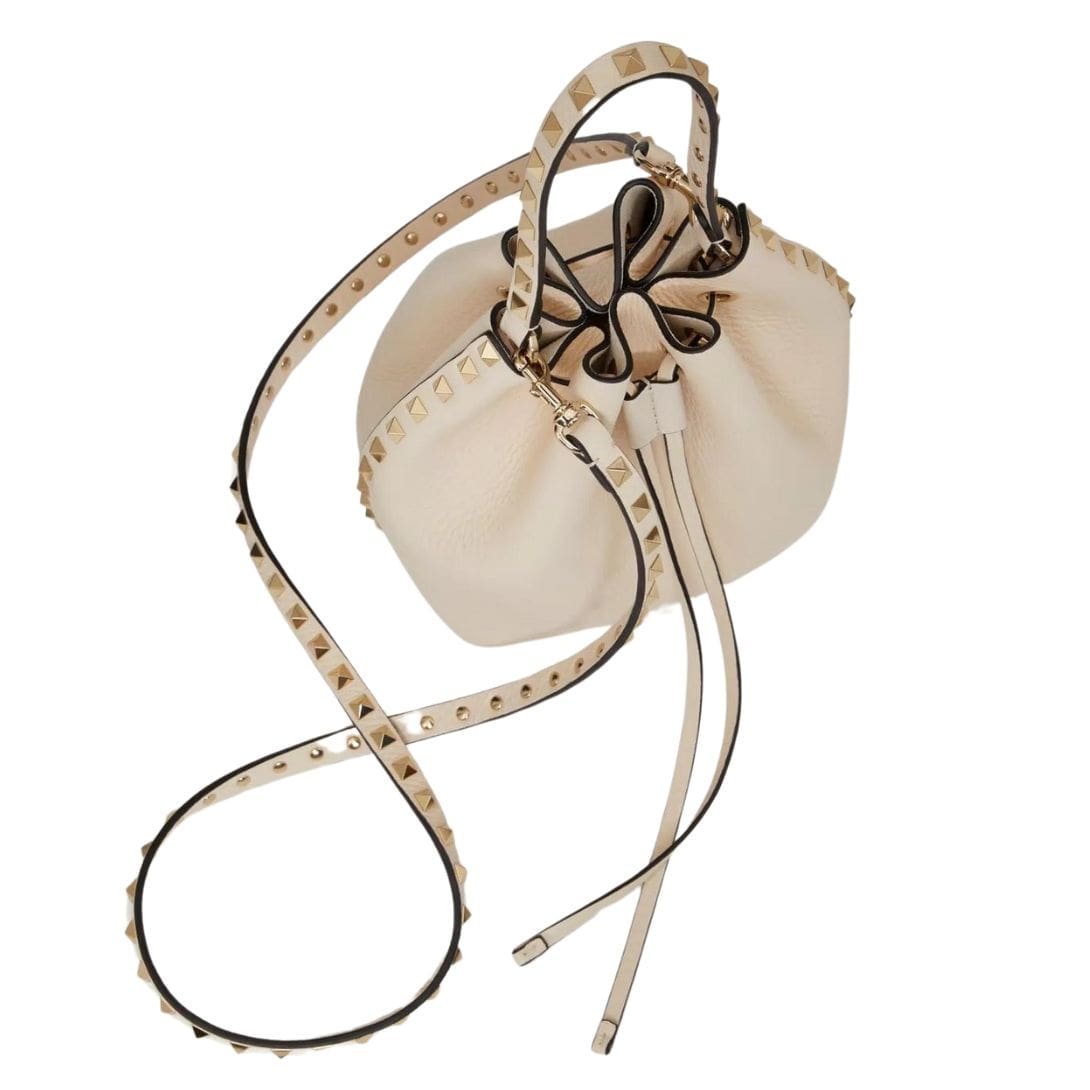 Introducing the valentino rockstud grainy calfskin bucket bag.