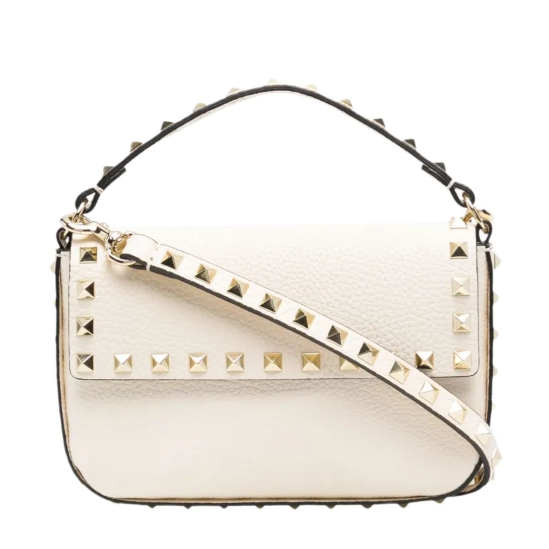 Adorned with the brand’s iconic gold-tone Rockstud embellishments, this piece reflects Valentino’s signature edgy-chic aesthetic. Each stud is meticulously placed to enhance the bag’s structured silhouette while offering a modern, rebellious flair.