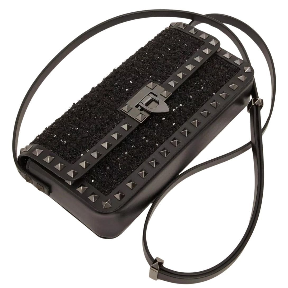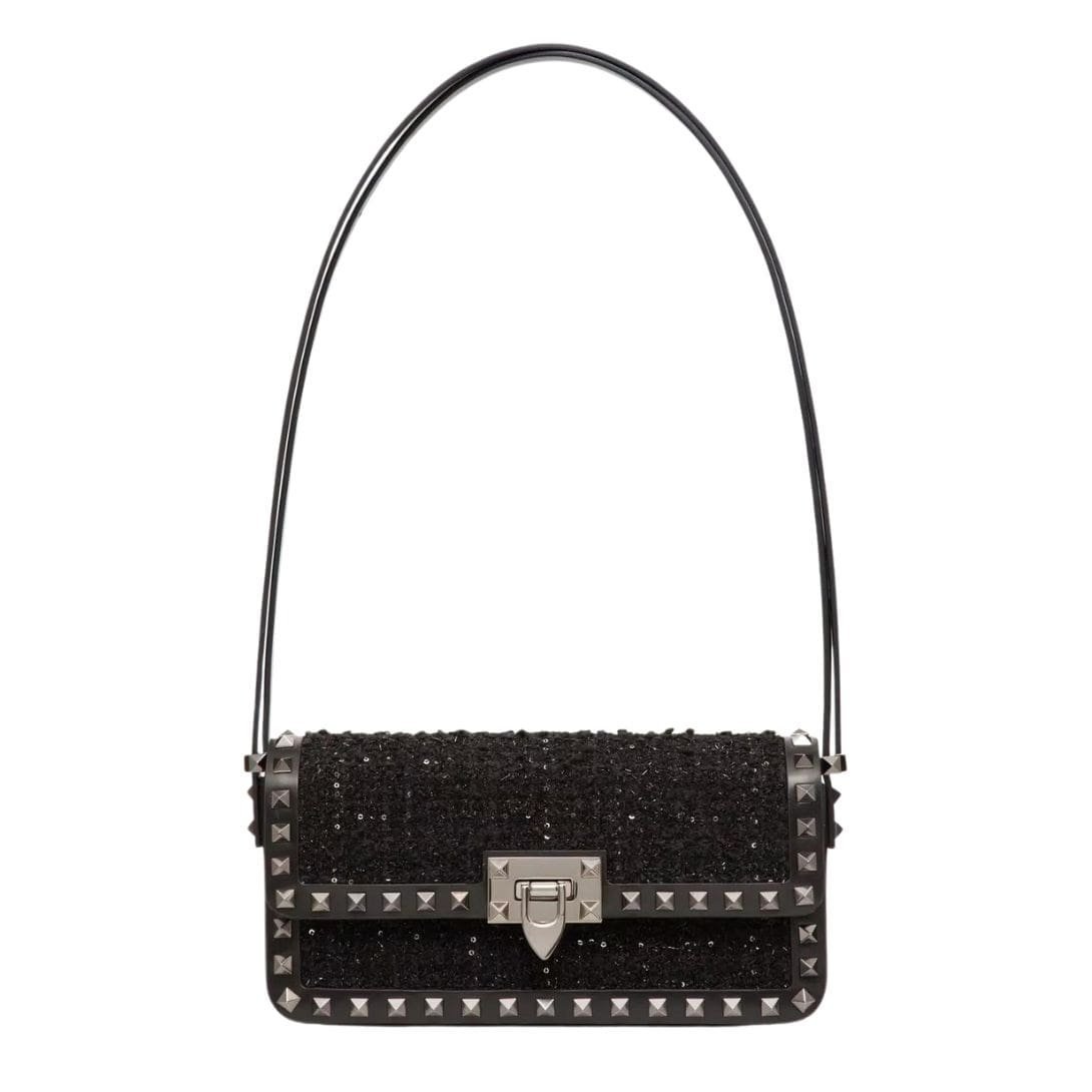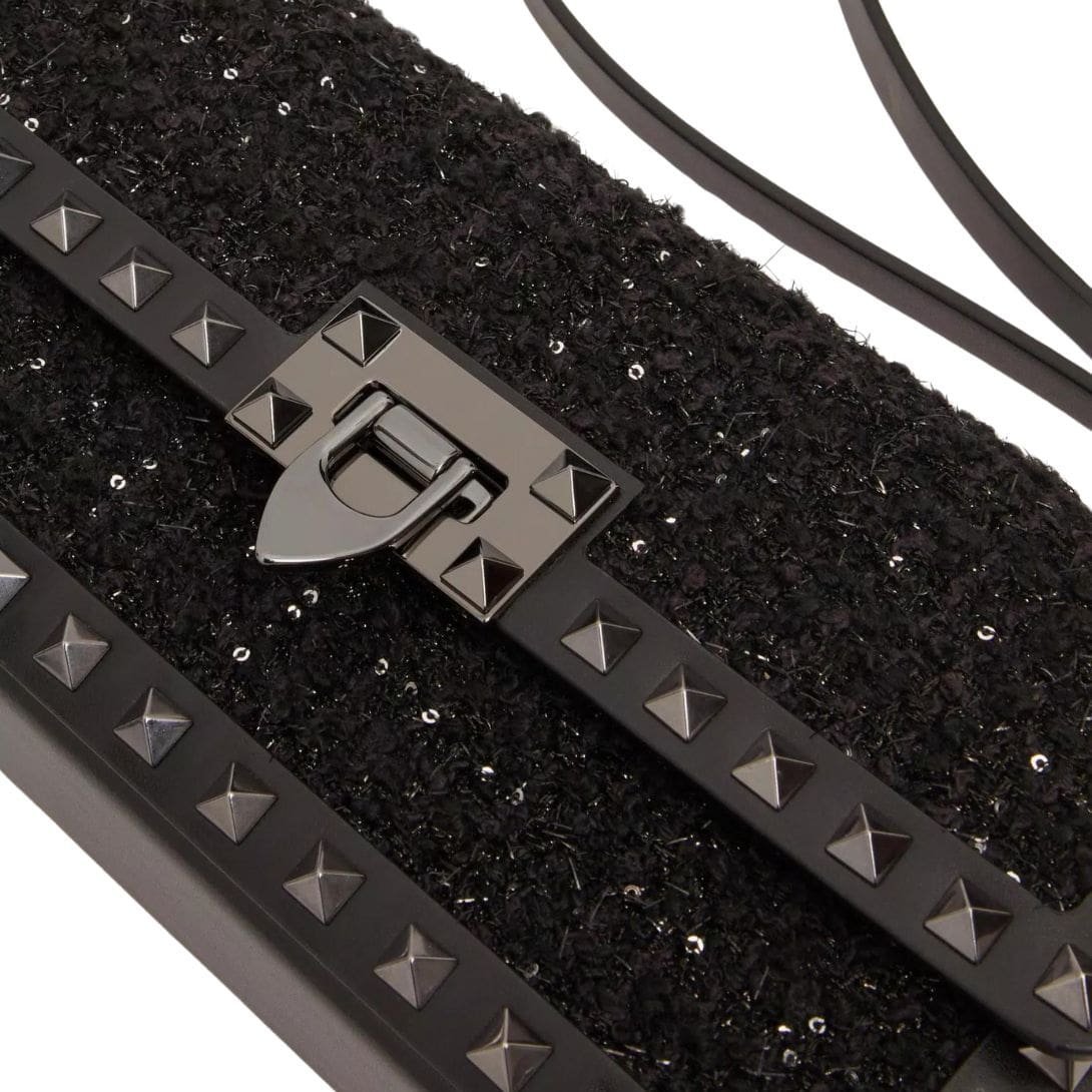 Introducing the valentino rockstud23 e/w tweed shoulder bag, featuring tweed embellished with micro sequins and adorned with tone-on-tone stud trim. This stylish bag offers versatility for shoulder or crossbody wear, thanks to its adjustable shoulder strap. The ruthenium-finish hardware adds a modern touch, complementing the iconic hook closure for security. Inside, discover the luxurious nappa leather lining and a slip pocket for organization.