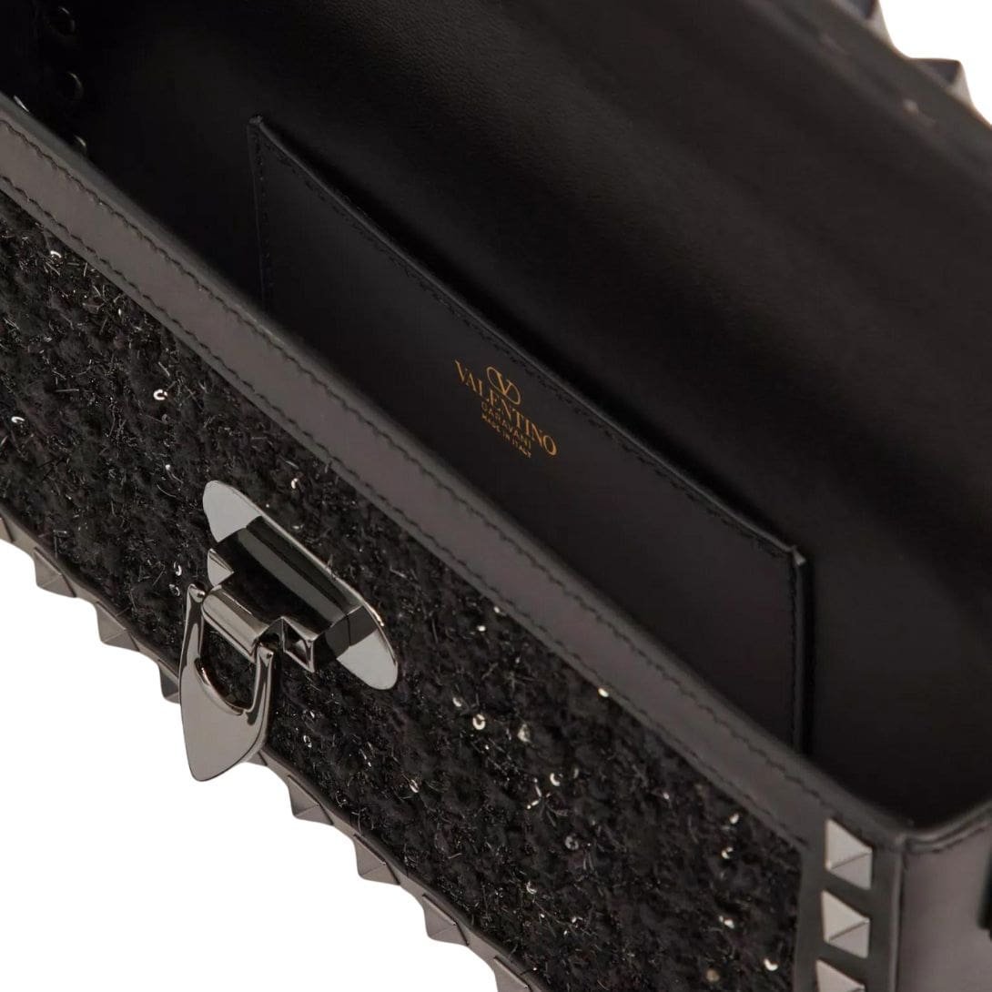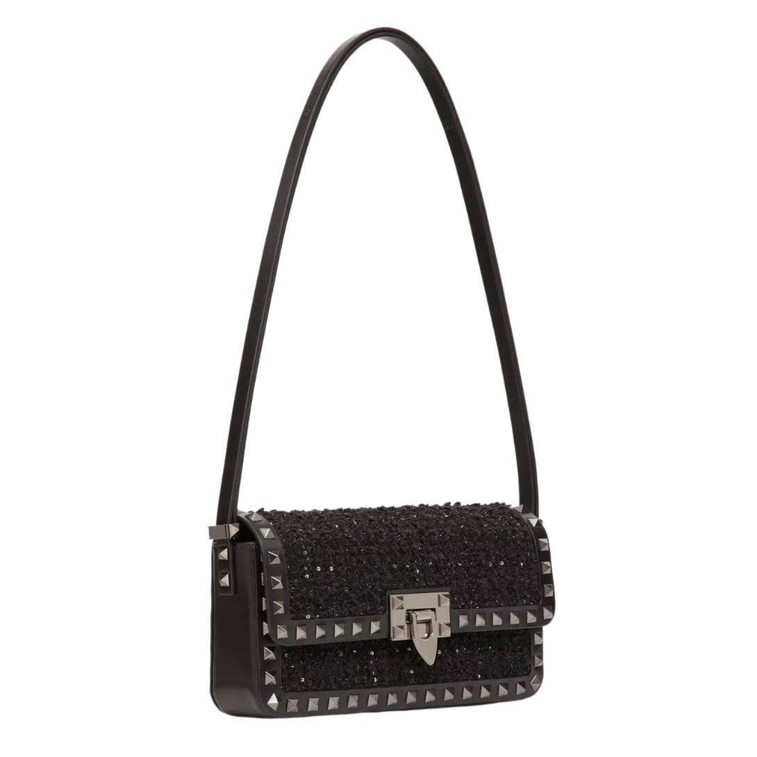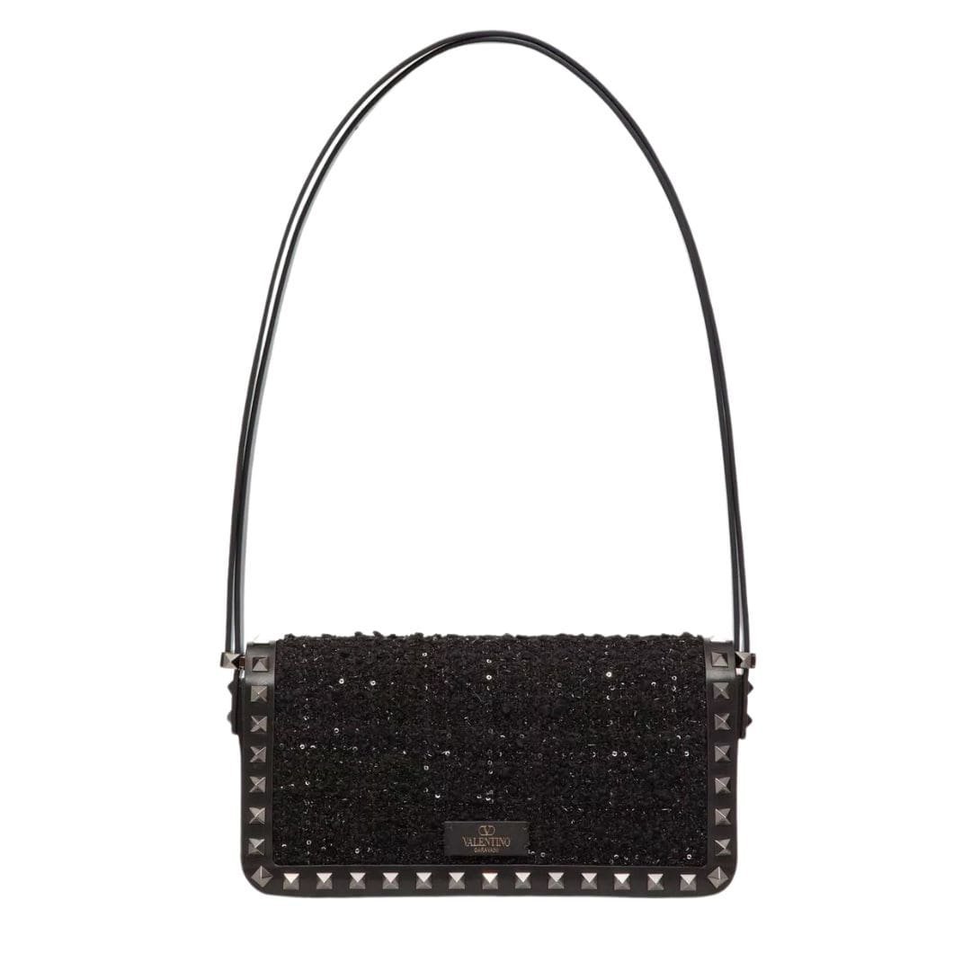 Introducing the valentino rockstud23 e/w tweed shoulder bag, featuring tweed embellished with micro sequins and adorned with tone-on-tone stud trim. This stylish bag offers versatility for shoulder or crossbody wear, thanks to its adjustable shoulder strap. The ruthenium-finish hardware adds a modern touch, complementing the iconic hook closure for security. Inside, discover the luxurious nappa leather lining and a slip pocket for organization.