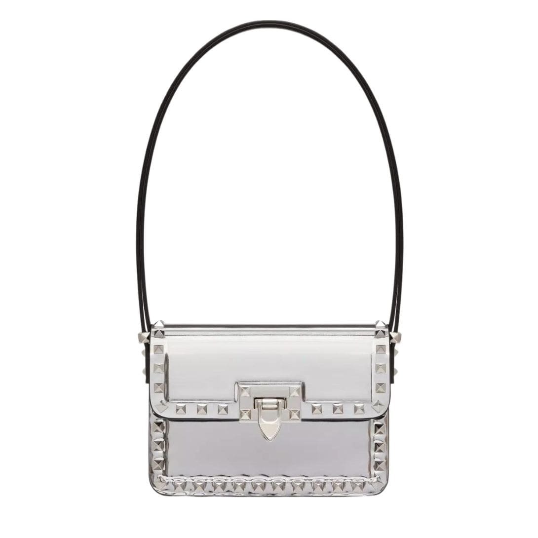 Introducing the valentino small rockstud hobo bag in grainy calfskin.