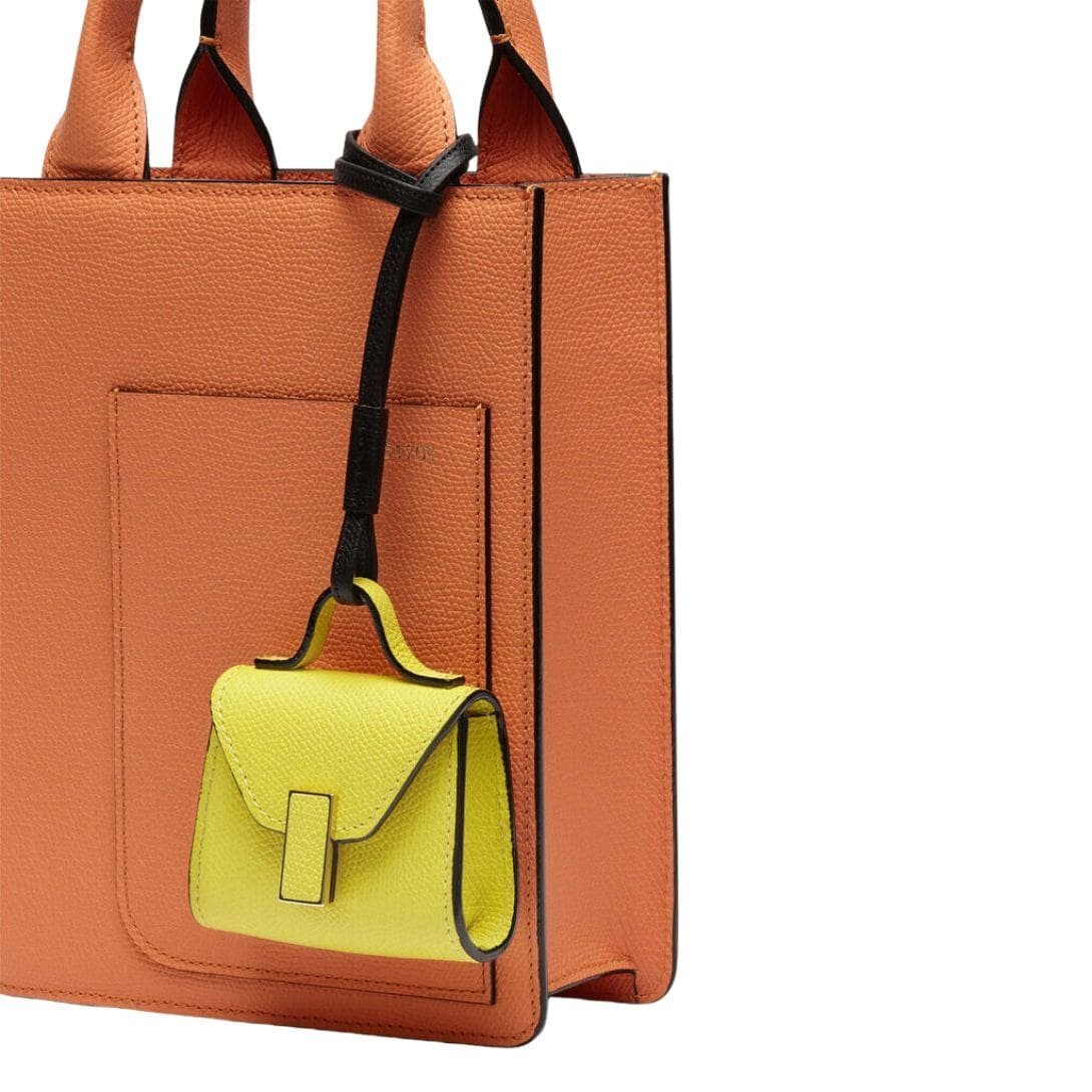 Our valextra Iside Charm in vibrant citrine yellow, crafted from multidimensional Millepunte calfskin, injects energy into any ensemble. Designed with convenience in mind, it can be effortlessly attached to the handle of a larger bag using its lanyard, ensuring that essentials like AirPods and other small items are always within secure and easy reach.