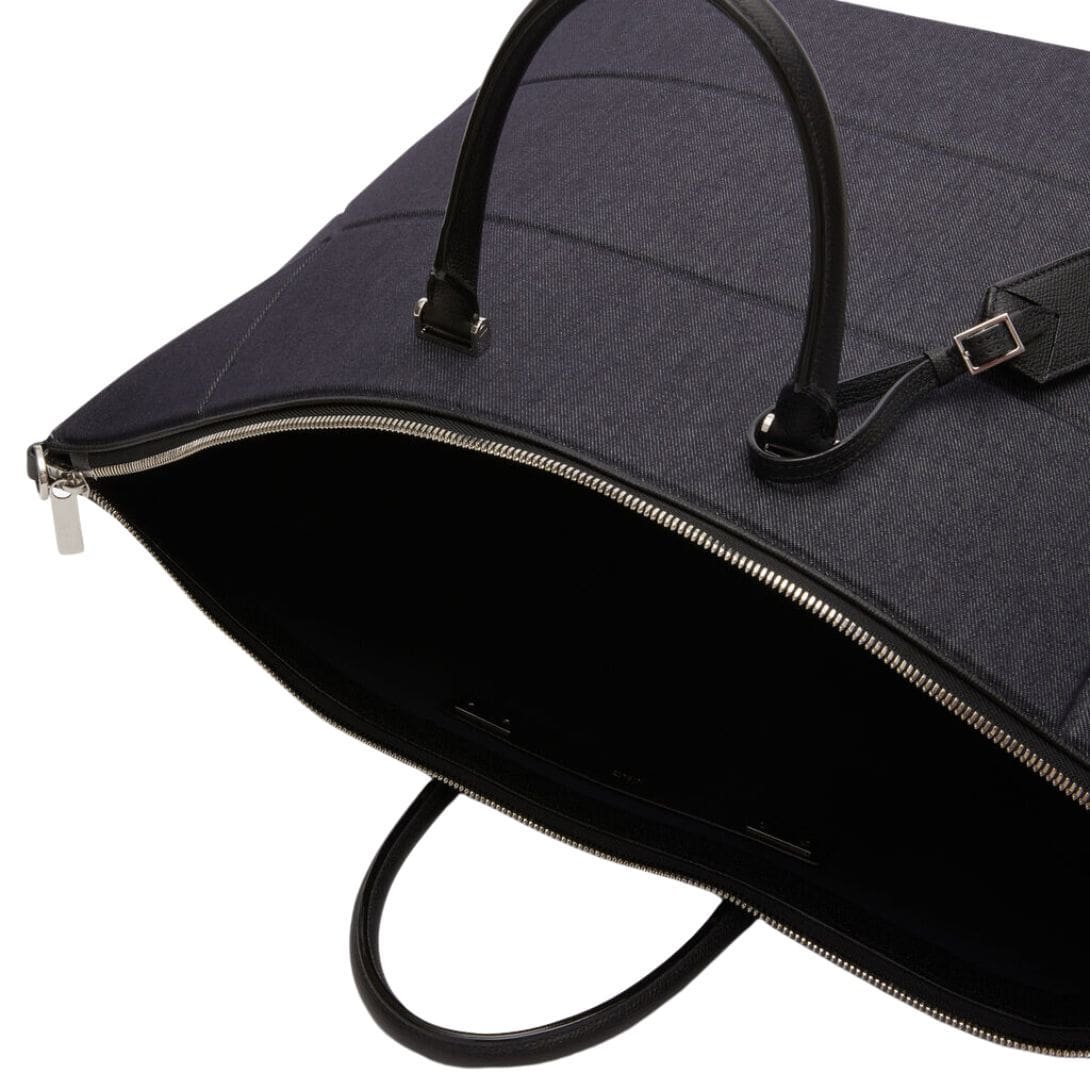 The valextra Polyhedral Weekender Denim Travel Bag made waves upon its debut, and its latest version solidifies its contemporary relevance. Crafted from our iconic Millepunte calf leather in a striking combination of Valextra Black and blue denim, it showcases both style and functionality. Its unique ability to fold completely flat enables effortless storage in tight spaces. Equipped with sturdy top handles and a detachable shoulder strap, it offers agility and versatility for every travel scenario. Representing our ethos of engineering beauty, it stands as a distinctive investment piece.