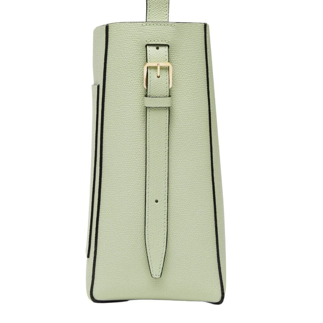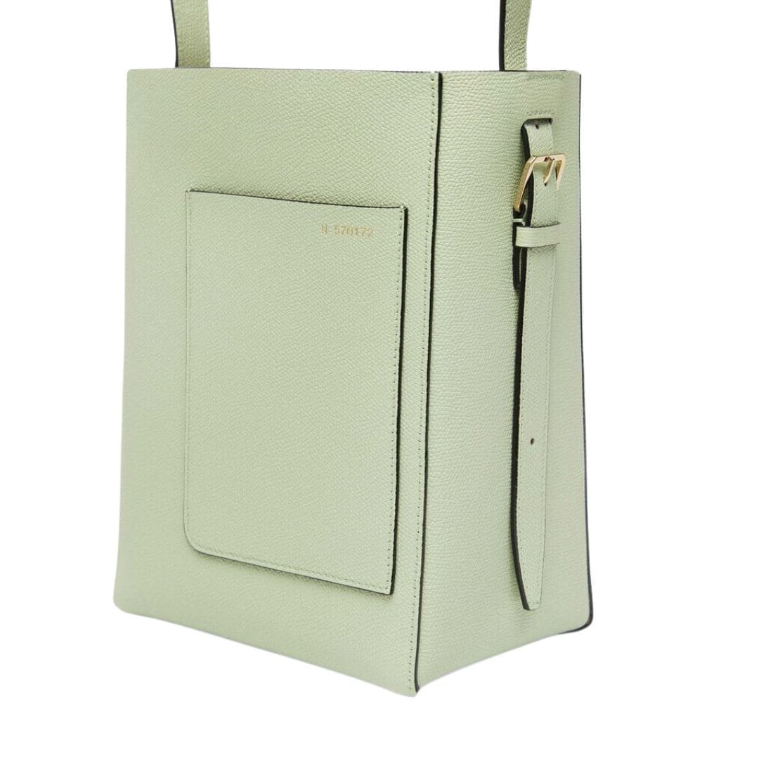 The Valextra soft Bucket Mini bag embodies the same urban flair as its larger counterpart but in a more compact size. This understated shoulder bag features a sturdy structure that maintains its shape effortlessly, while a small removable leather pouch ensures secure storage for belongings. Additionally, its discreet external curved pocket provides convenient access to cards and passes. Finished with our signature hand-painted black lacquered Costa edging, this mint green companion exudes distinction, making it an ideal everyday accessory.