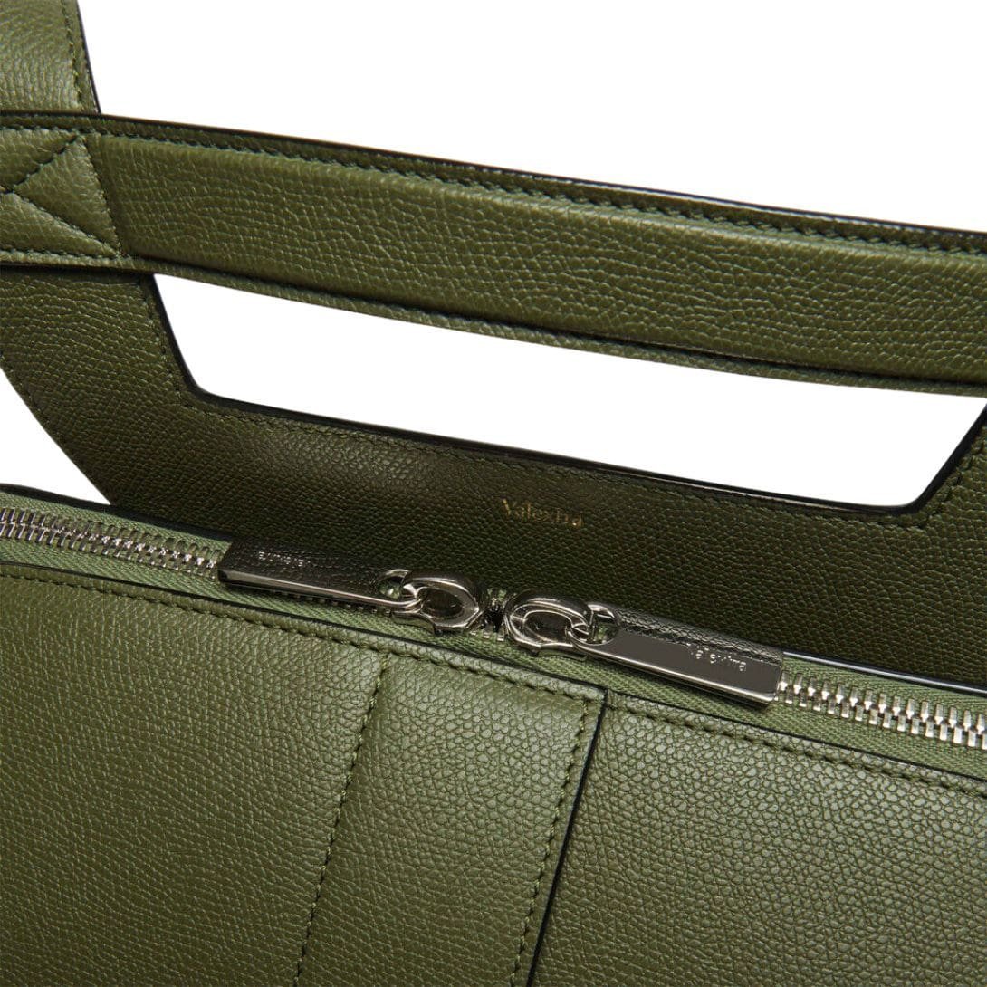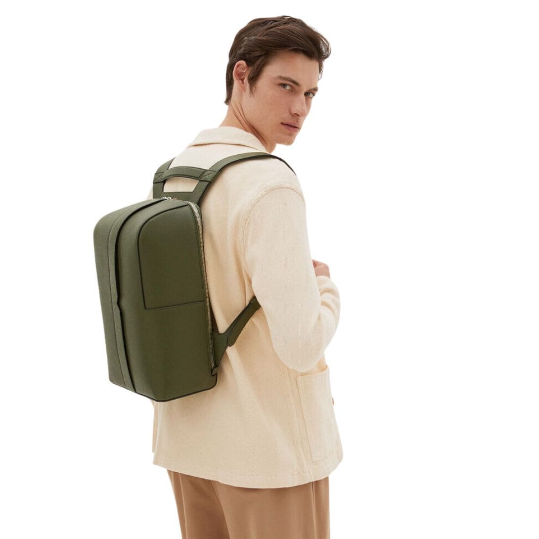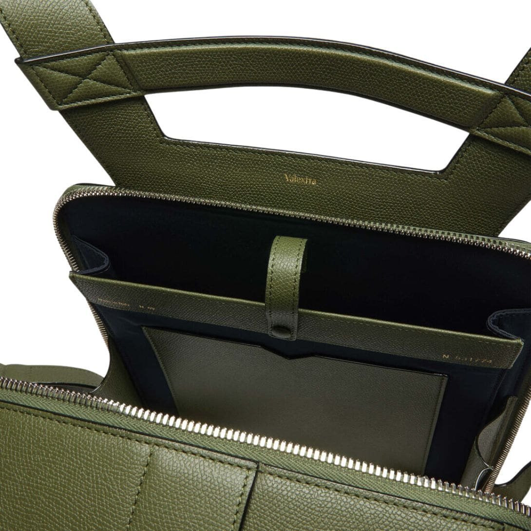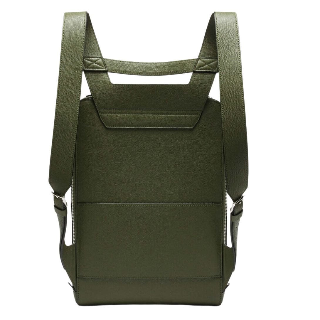 Drawing inspiration from Valextra’s iconic Tric Trac silhouette, the valextra V-Line Backpack in military green Millepunte calf exemplifies the brand’s dedication to urban craftsmanship. Handcrafted for optimal comfort, it serves as a stylish and spacious travel companion, perfect for both holiday getaways and business trips.