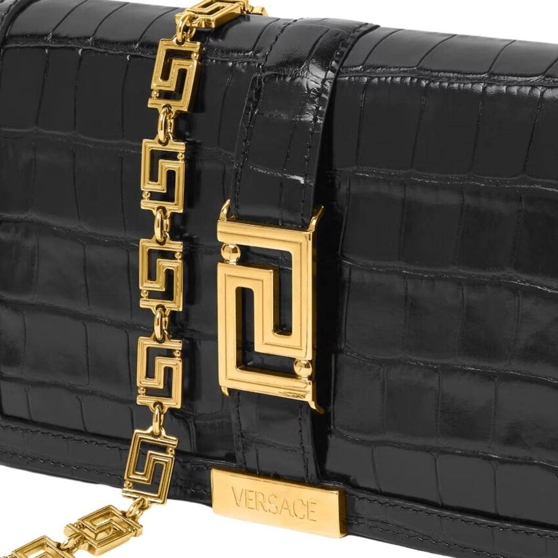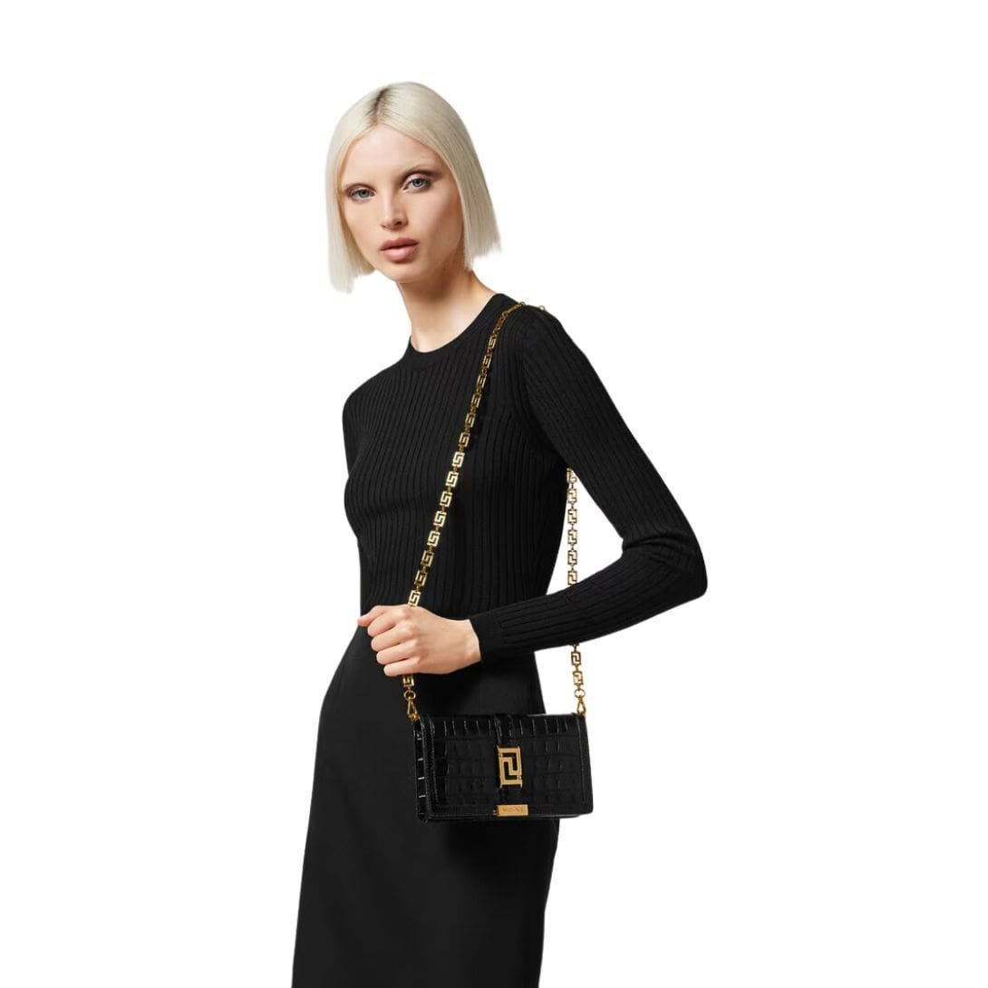 Versatile yet undeniably luxurious, the Croc-Effect Greca Goddess Mini Bag seamlessly transitions from day to night, complementing both casual ensembles and evening attire with equal finesse. As a testament to Versace’s legacy of craftsmanship and innovation, this miniature masterpiece embodies the epitome of Italian luxury, destined to become a treasured heirloom for generations to come.