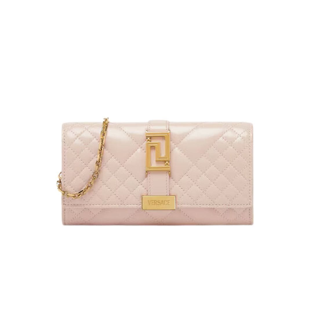 At first glance, the bag’s exterior exudes sophistication, featuring the iconic Greca motif that is synonymous with the Versace brand. The Greca pattern, inspired by ancient Greek architecture, adorns the supple leather surface, creating a sense of regality and prestige. Its intricate design pays homage to the rich cultural heritage that has long inspired Versace’s creations.