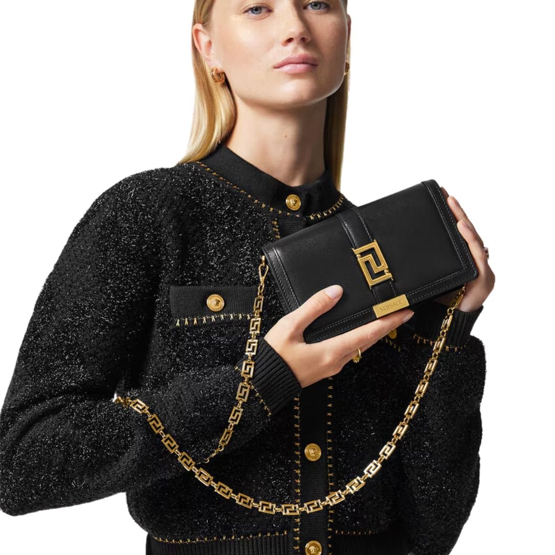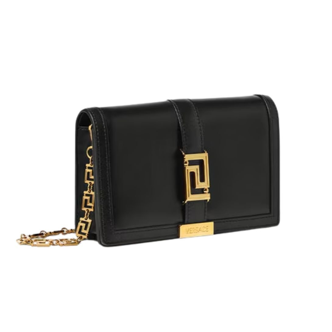 Elevate your evening ensemble with the Greca Goddess Mini Bag, a striking accessory defined by Versace’s iconic Greca chain hardwarea continuous, unbroken symbol of unity and strength. Expertly crafted in Italy from smooth calf leather, this sophisticated piece fuses timeless design with modern versatility.