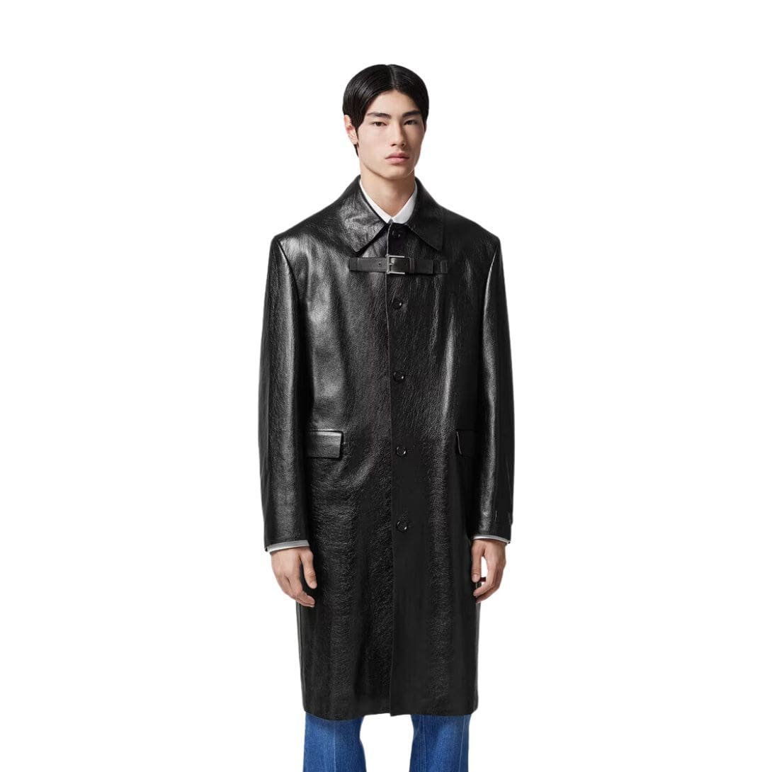 The Versace long leather coat embodies the epitome of luxury and sophistication, melding timeless elegance with contemporary allure. Crafted with meticulous attention to detail, it exudes an air of opulence that is unmistakably Versace.