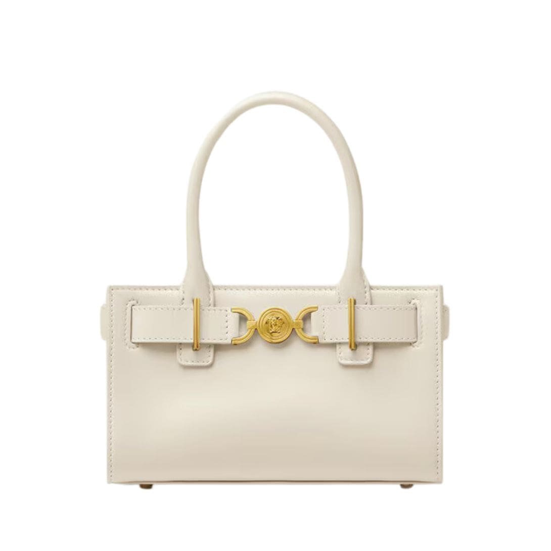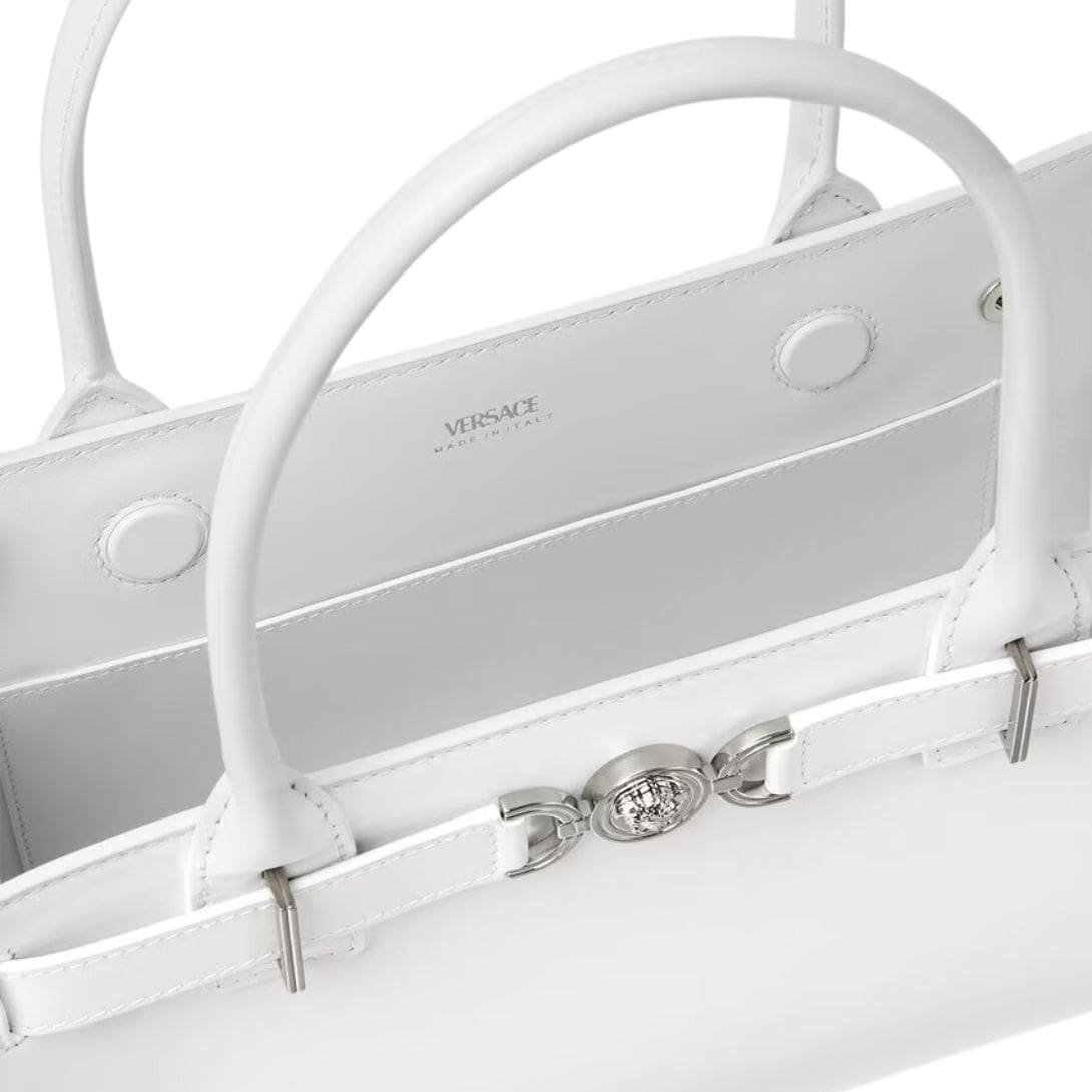 The front of the tote bag prominently displays the signature Medusa head in a stunning gold-tone finish, instantly recognizable and embodying the brand’s rich heritage. The attention to detail is evident in the meticulously crafted embellishments and the flawless stitching that exudes craftsmanship and quality.