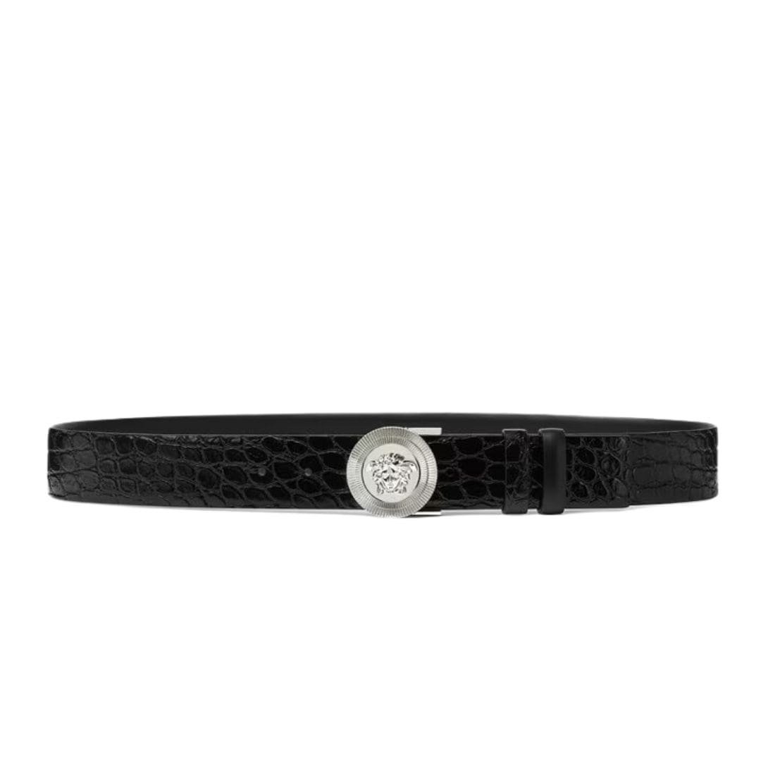 At the heart of the belt lies the unmistakable Versace aesthetic, characterized by its boldness and extravagance. The signature Medusa head emblem takes center stage, intricately embellished on the belt buckle. Symbolizing power, allure, and allure, the Medusa motif adds a touch of mythological grandeur to the accessory, instantly commanding attention and admiration.