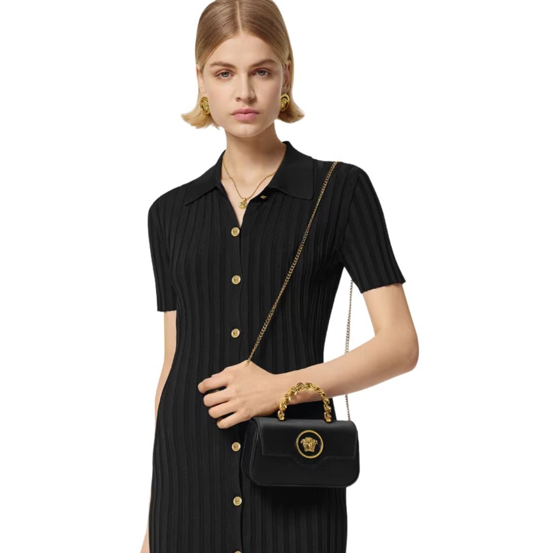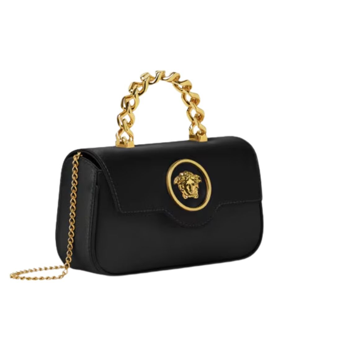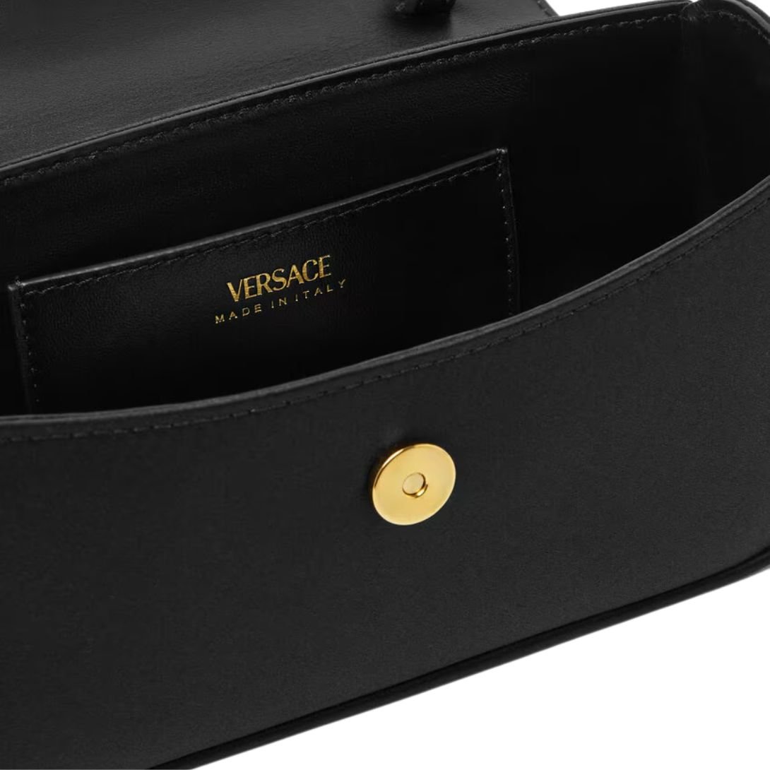 Perfectly polished for evening occasions, this mini bag is where elegance meets modern Versace attitude.