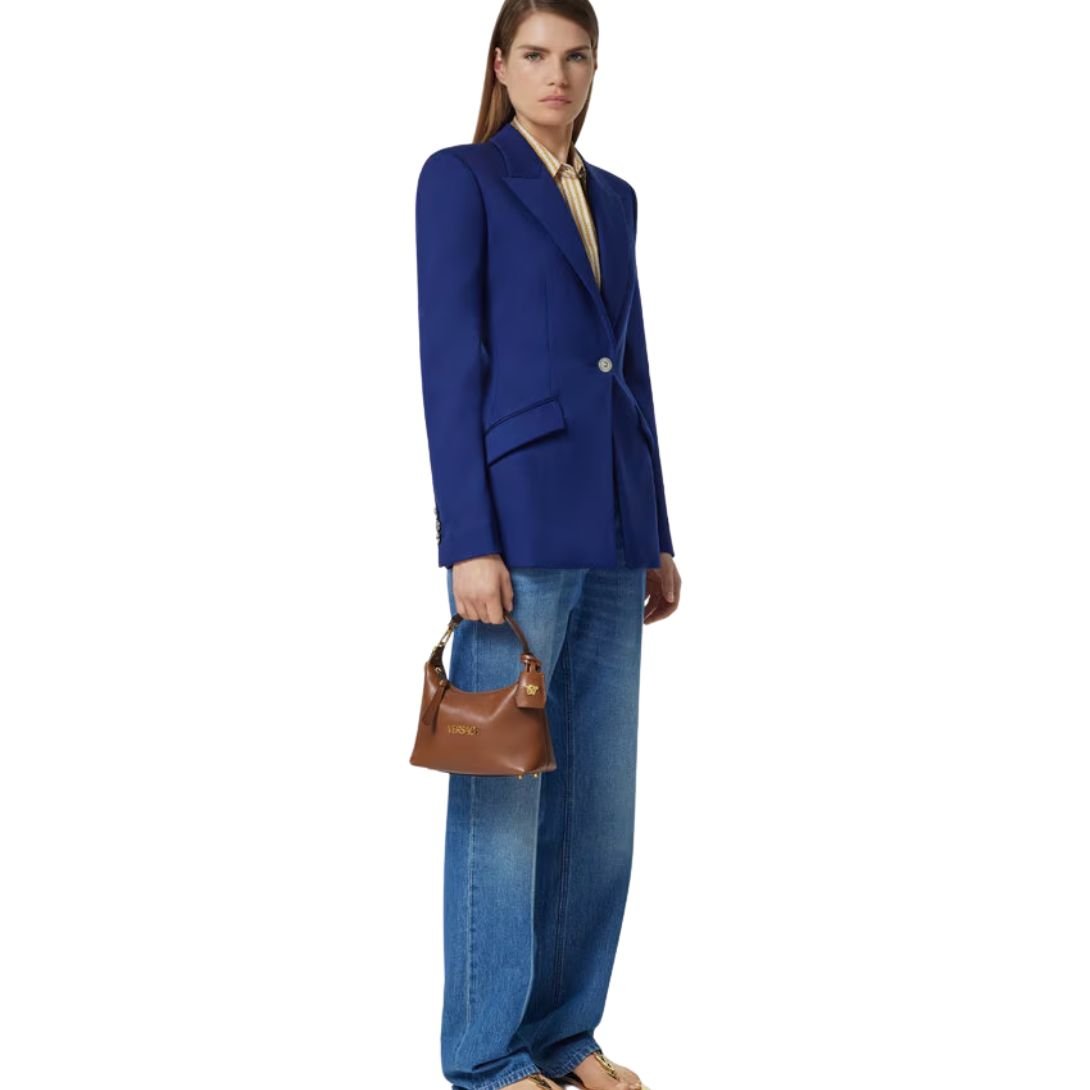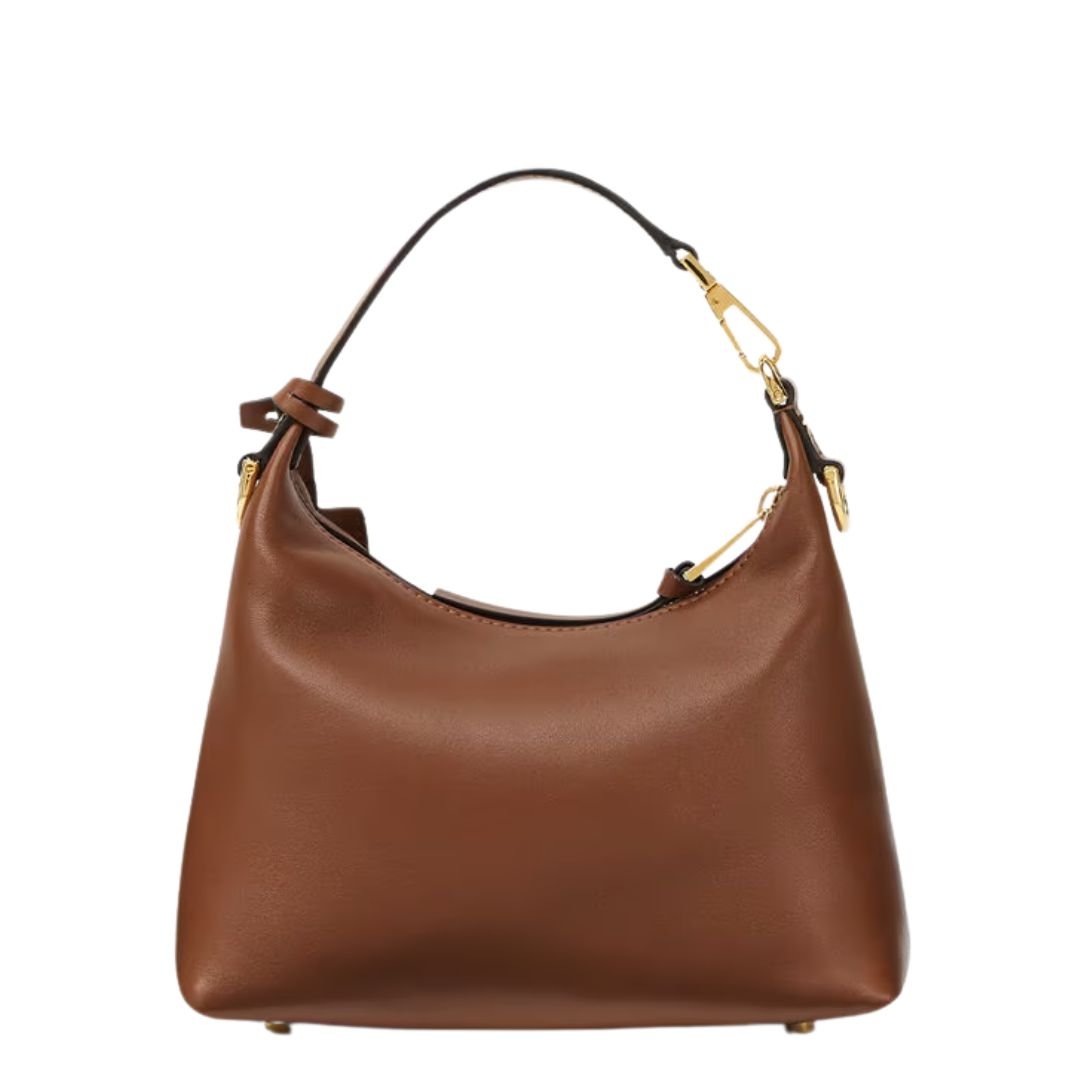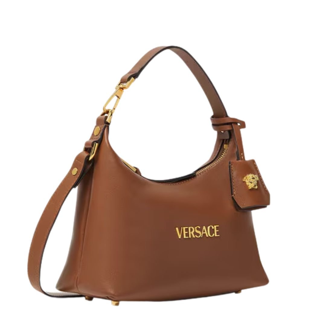 Crafted from ultra-soft nappa leather, the Versace Tag Hobo Bag blends everyday versatility with unmistakable luxury. Its fluid, minimalist silhouette is accented by metallic Versace logo lettering, while the removable leather tag keychain with Medusa hardware adds a signature finishing touch.