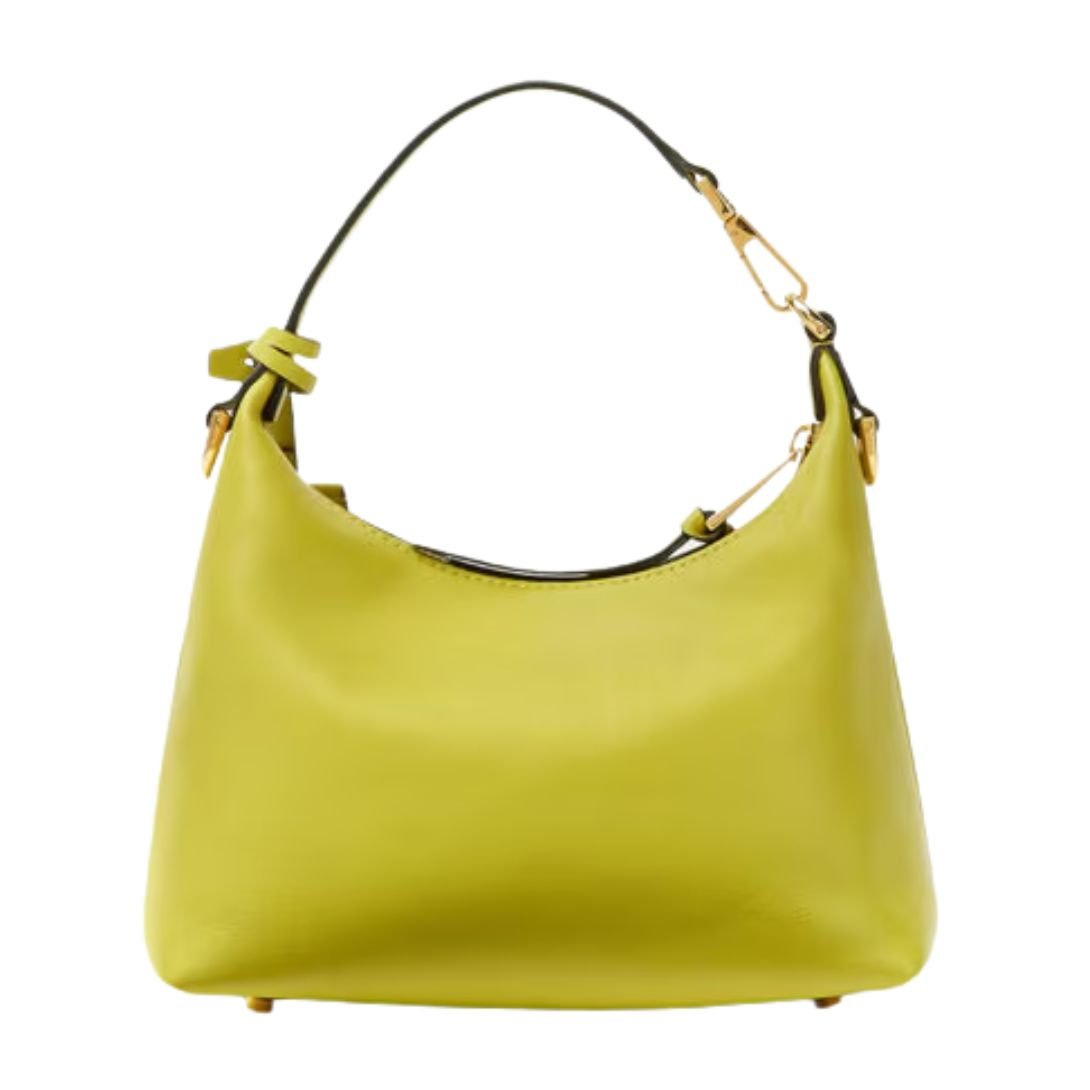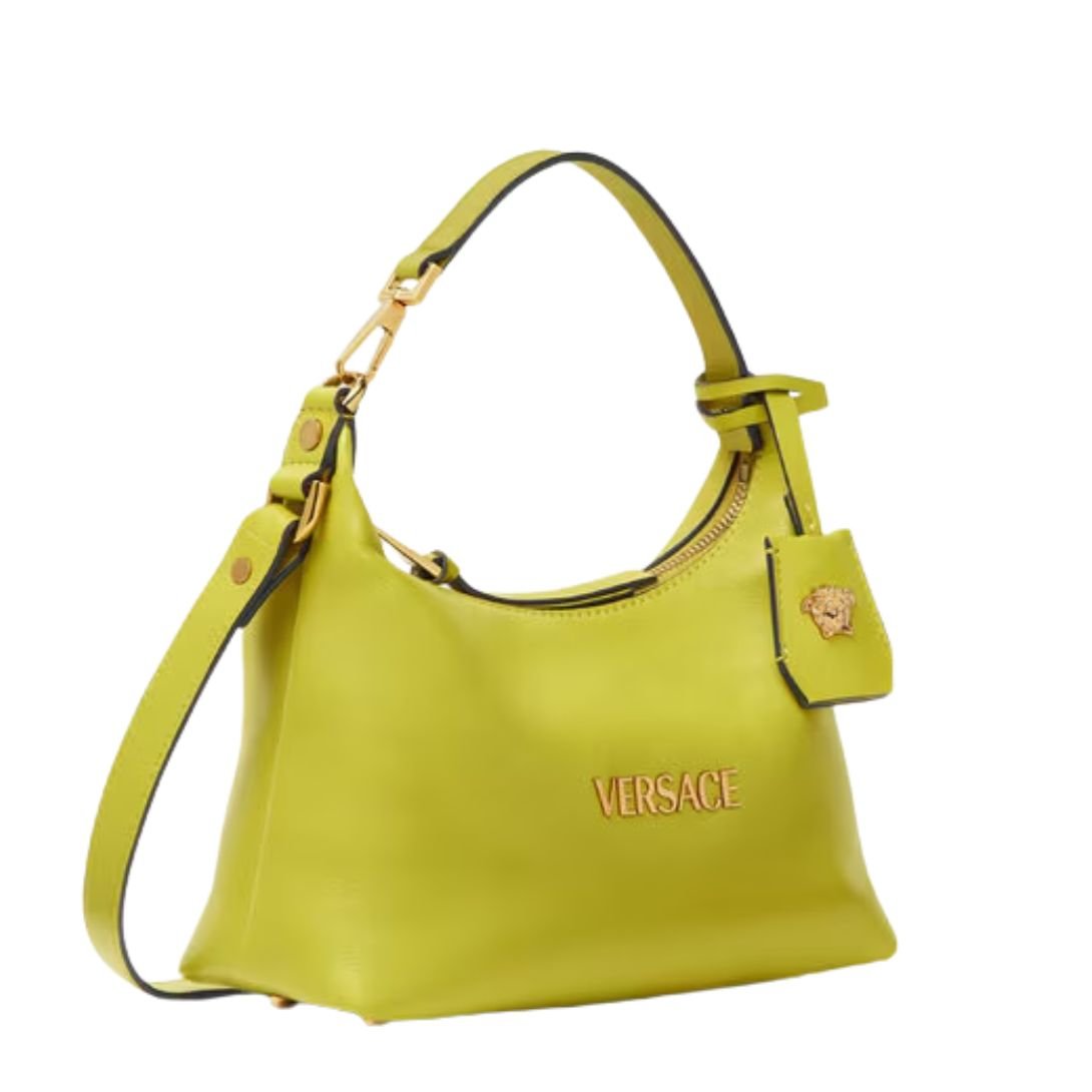 Crafted from ultra-soft nappa leather, the Versace Tag Hobo Bag blends everyday versatility with unmistakable luxury. Its fluid, minimalist silhouette is accented by metallic Versace logo lettering, while the removable leather tag keychain with Medusa hardware adds a signature finishing touch.