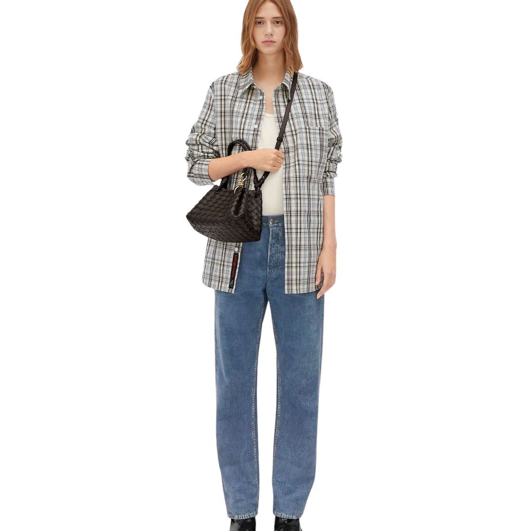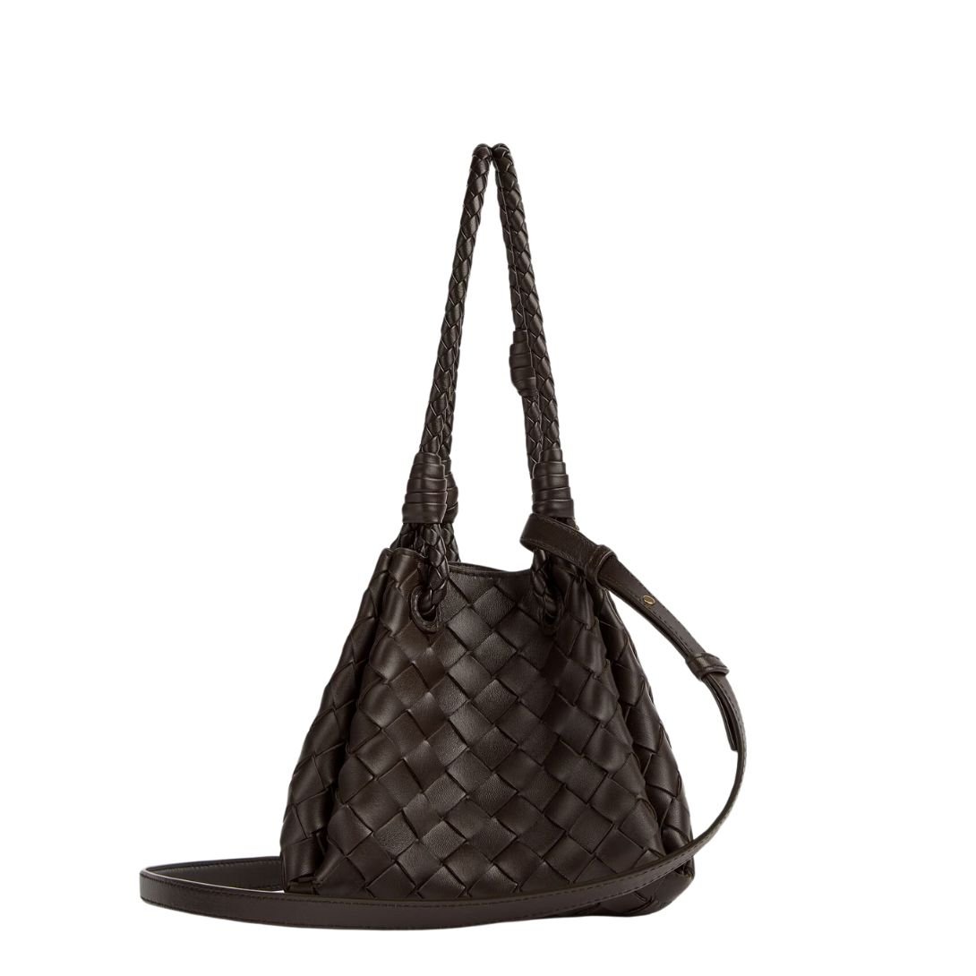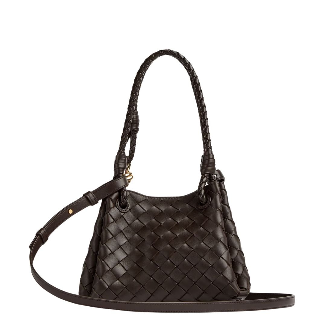 Designed for versatility, it features a detachable cross-body strap and comfortable top handles, offering multiple styling options. A magnetic tab closure secures the spacious main compartment, lined in bonded Intrecciato lambskin for a seamless, luxurious interior finish.