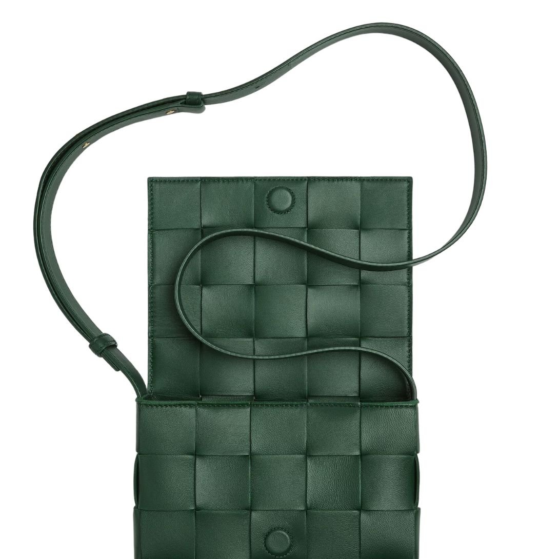 Handcrafted in lambskin bonded Intreccio, the bag features a discreet magnetic closure, opening to a refined interior fitted with a single zipped pocket—perfect for securing small essentials. The gold-finish hardware adds a subtle contrast of warmth, while the slim cross-body strap ensures effortless wear.