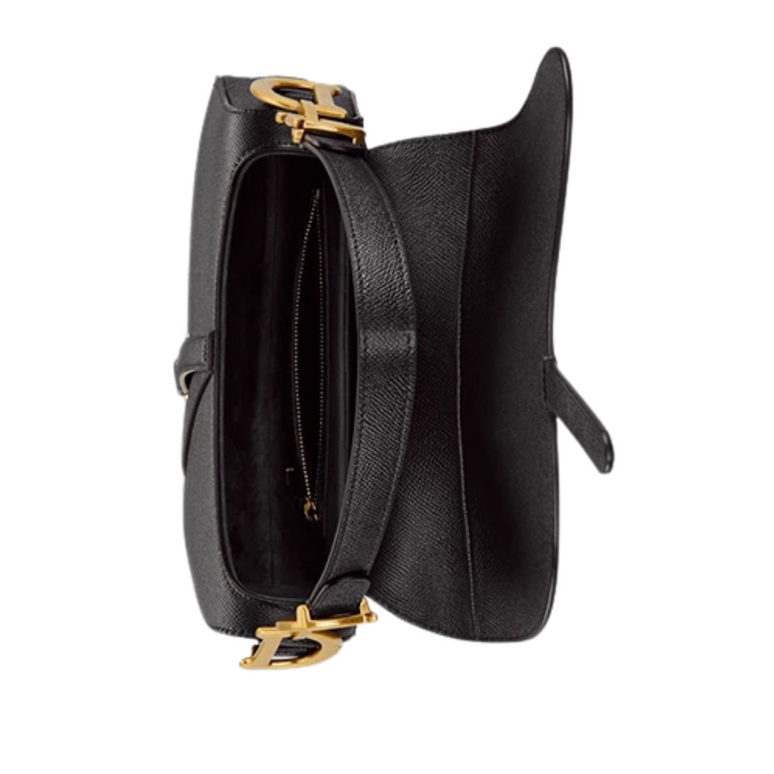 The instantly recognizable Saddle flap is shaped with couture precision, anchored by the distinctive D stirrup magnetic closure, a detail that nods to equestrian elegance. Accentuating both sides of the top handle are antique gold-finish metal CD signatures, offering a subtle yet unmistakable reference to Dior’s storied legacy. The craftsmanship is impeccable, blending artistry and utility in a silhouette that has transcended seasons.