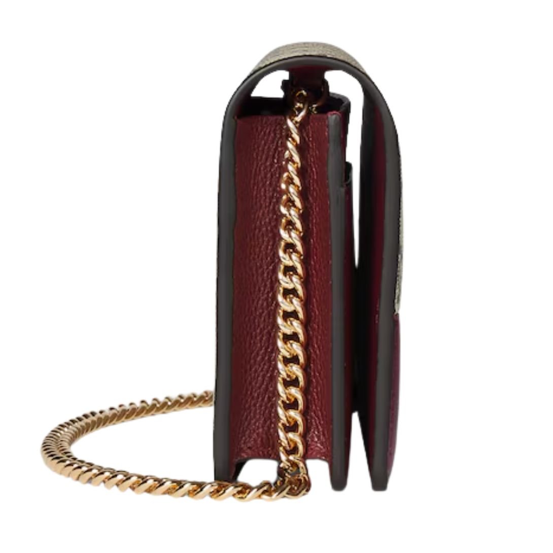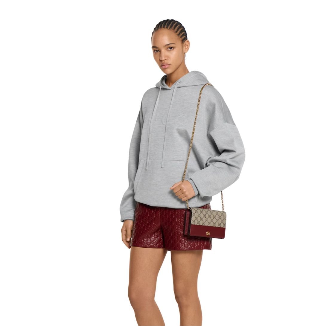 Fusing classic heritage with bold sophistication, this GG Marmont wallet on chain pairs Gucci Rosso Ancora red leather with beige and dark brown GG Supreme canvas. The structured silhouette is finished with the House’s signature Double G hardware.