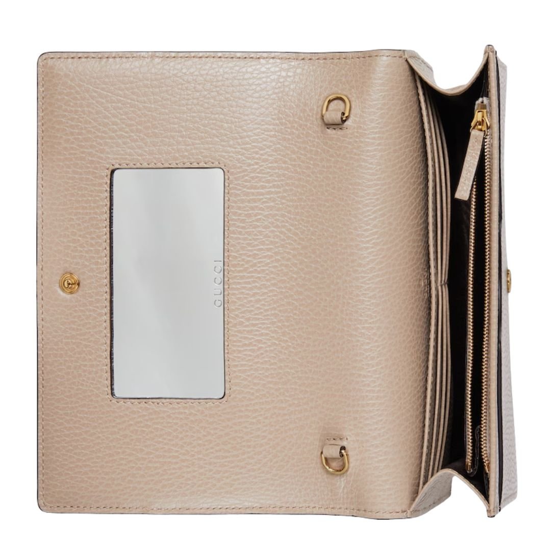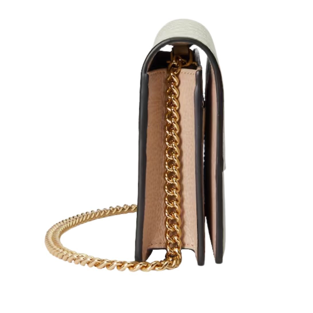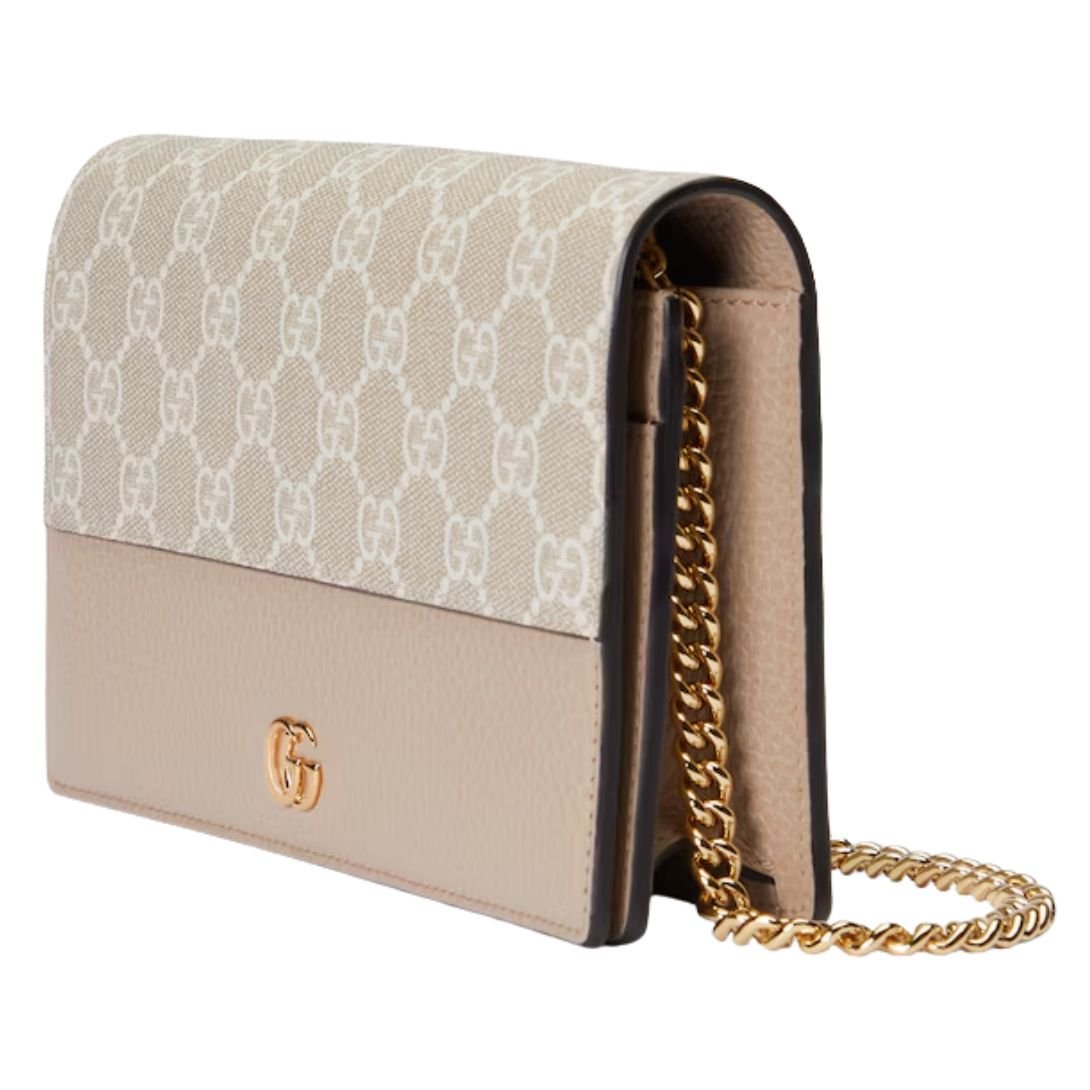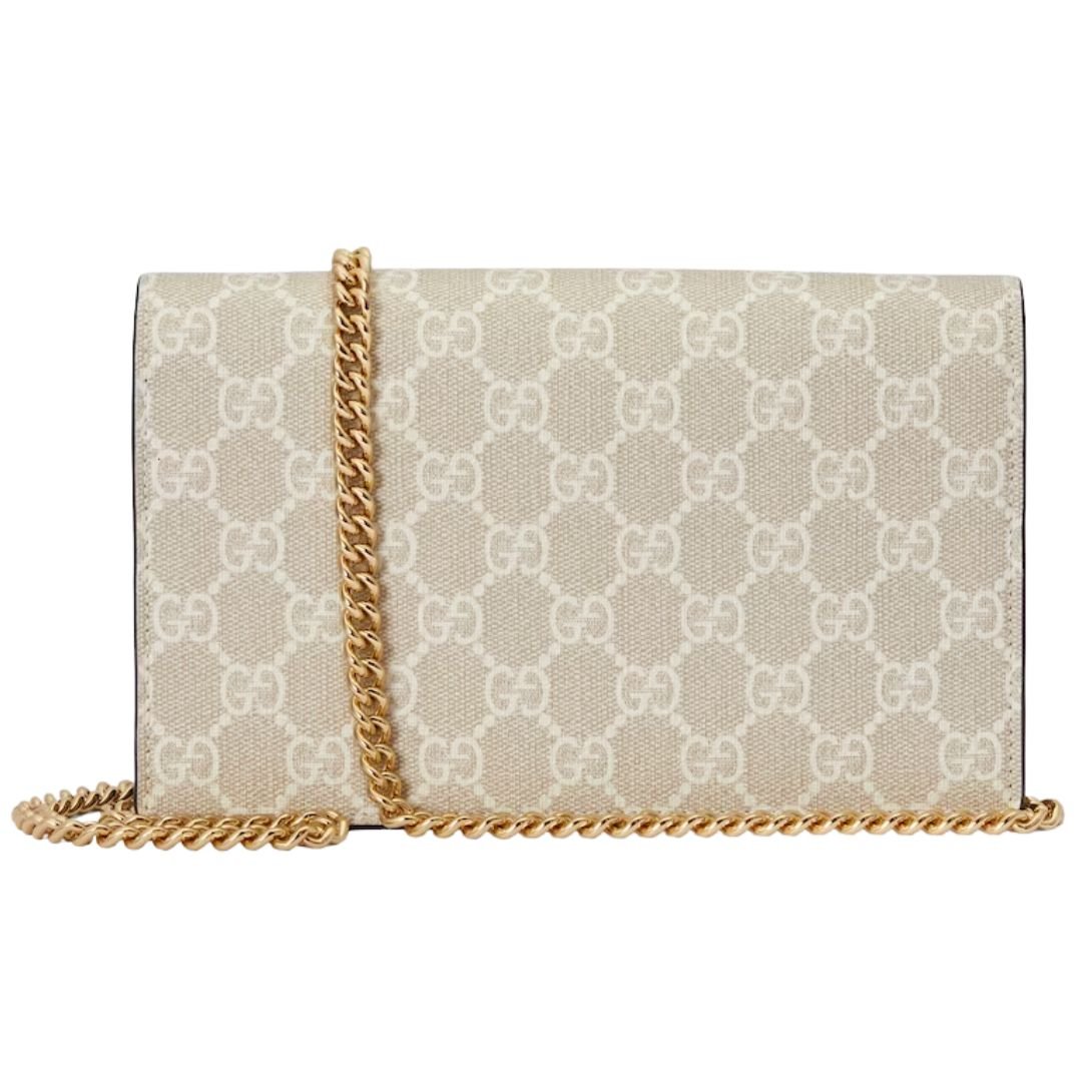 This GG Marmont wallet on chain features petite Double G hardware for a subtle nod to the brand’s iconic logo. The delicate combination of beige and white GG Supreme canvas with oatmeal leather trim offers a fresh twist on signature House motifs, perfectly balancing elegance and contemporary style.