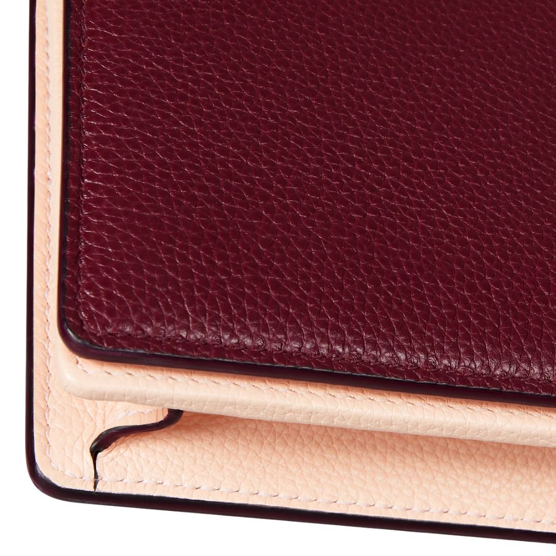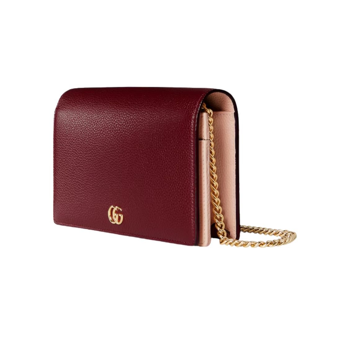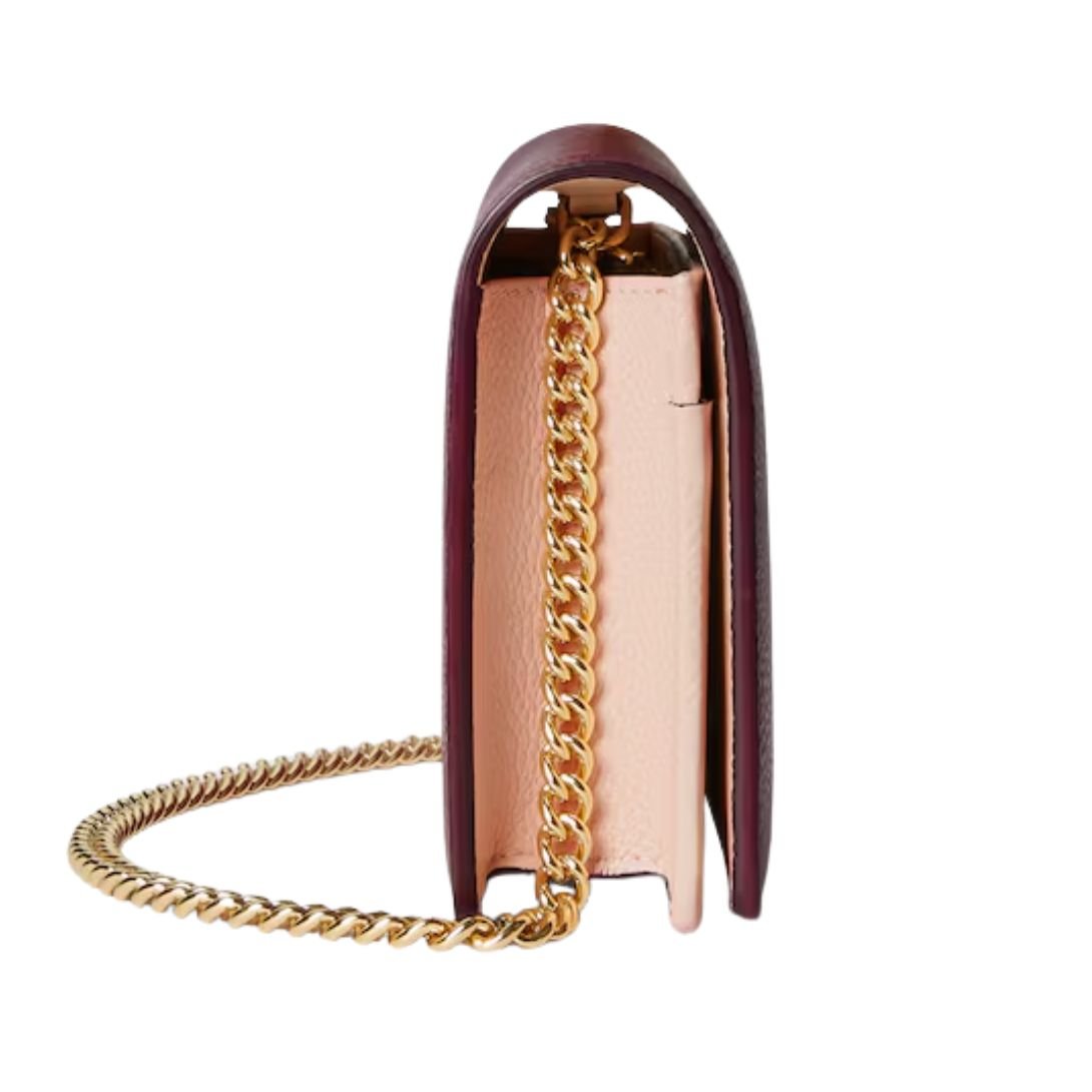 Elegant and versatile, this GG Marmont wallet on chain blends Gucci Rosso Ancora red and pink leather in a structured silhouette, highlighted by the iconic Double G hardware.