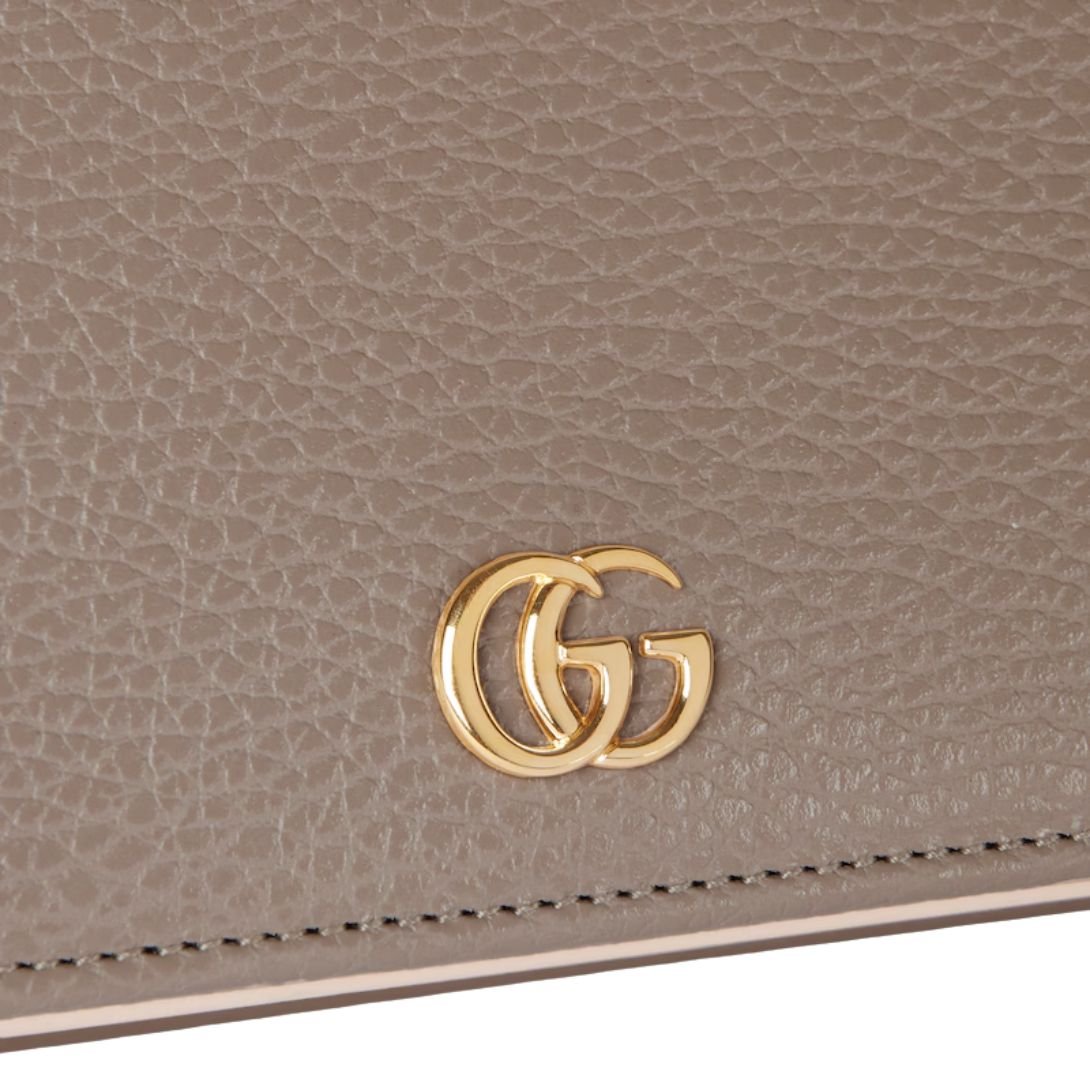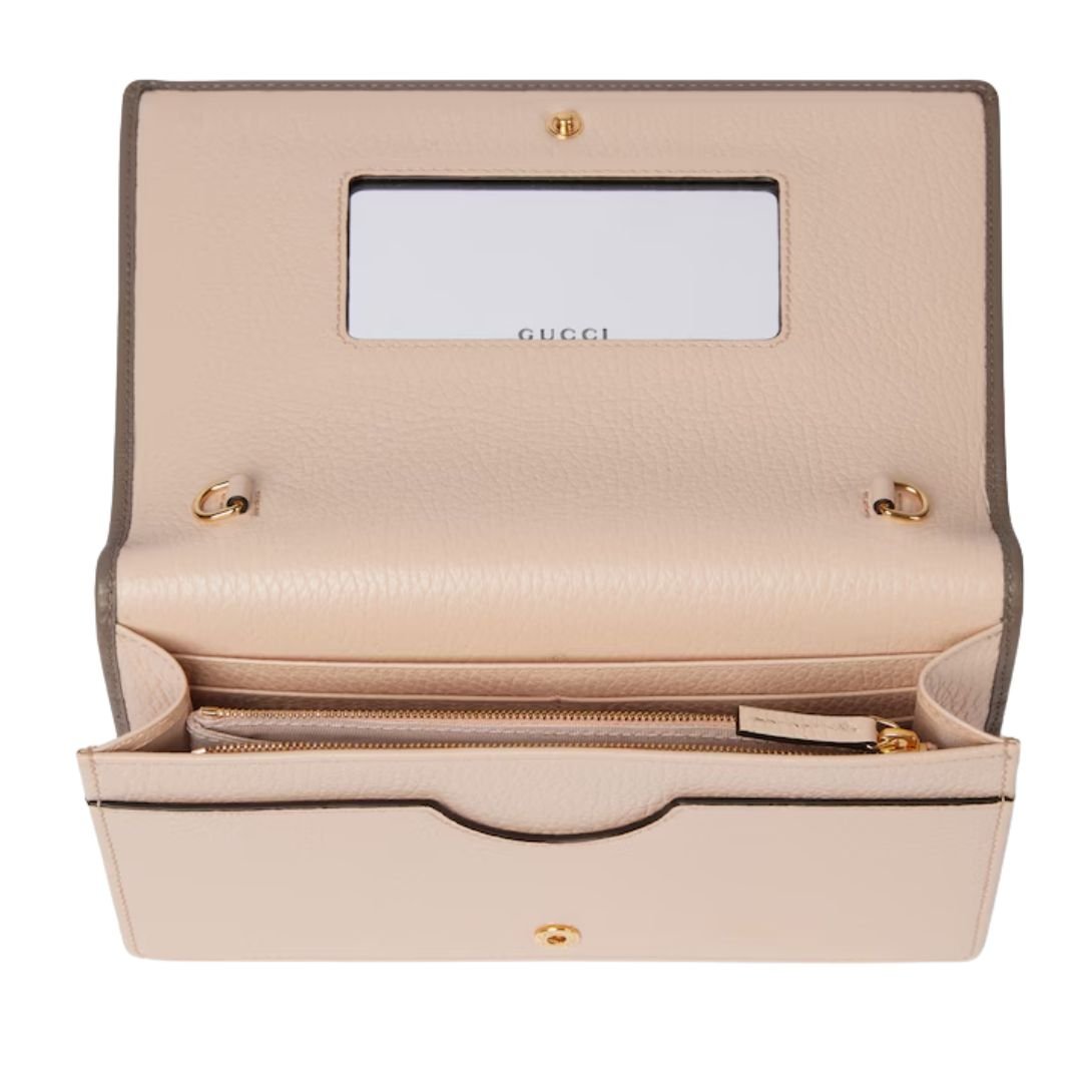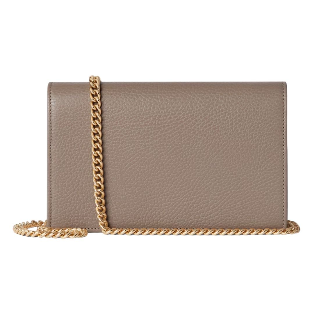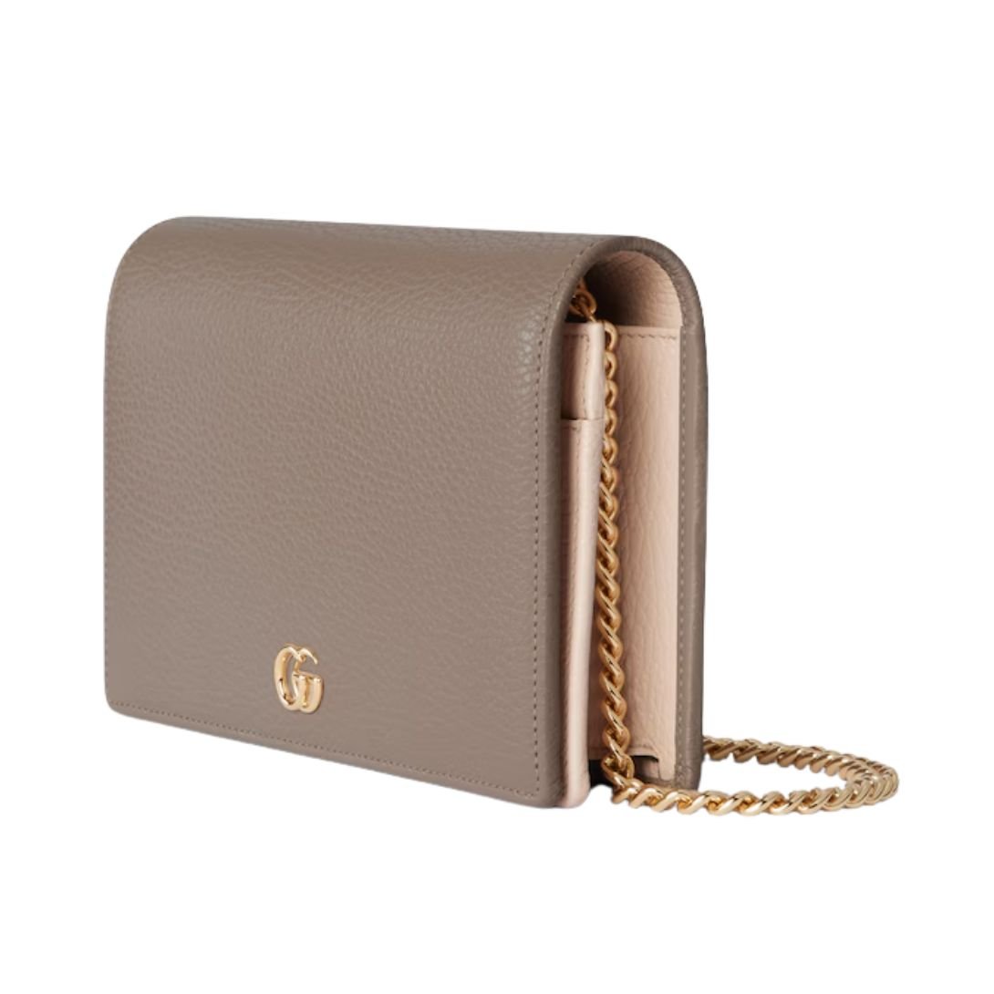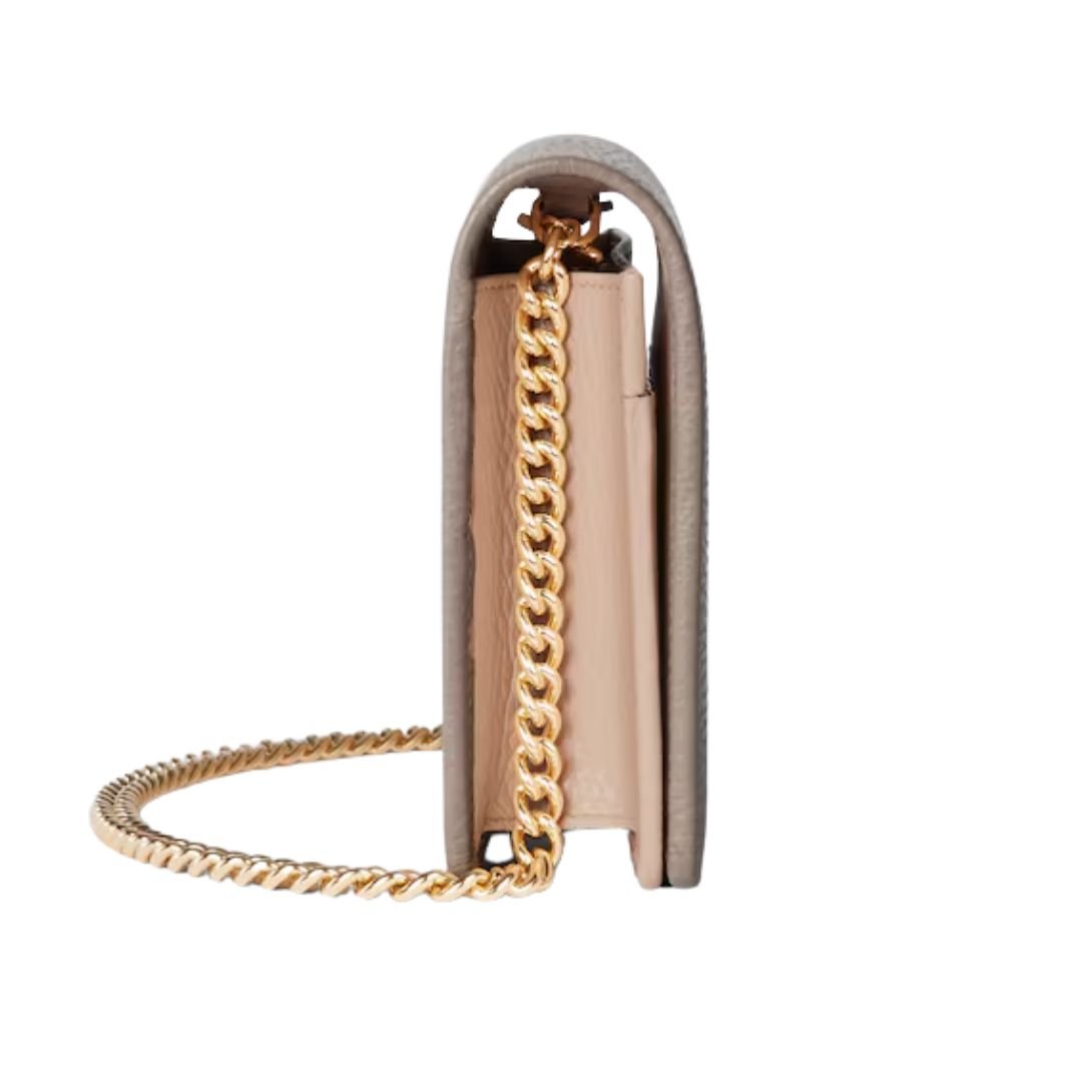 Expanding the GG Marmont small leather goods collection, Cruise 2025 introduces new colorways, including this refined wallet on chain crafted in smooth taupe leather.