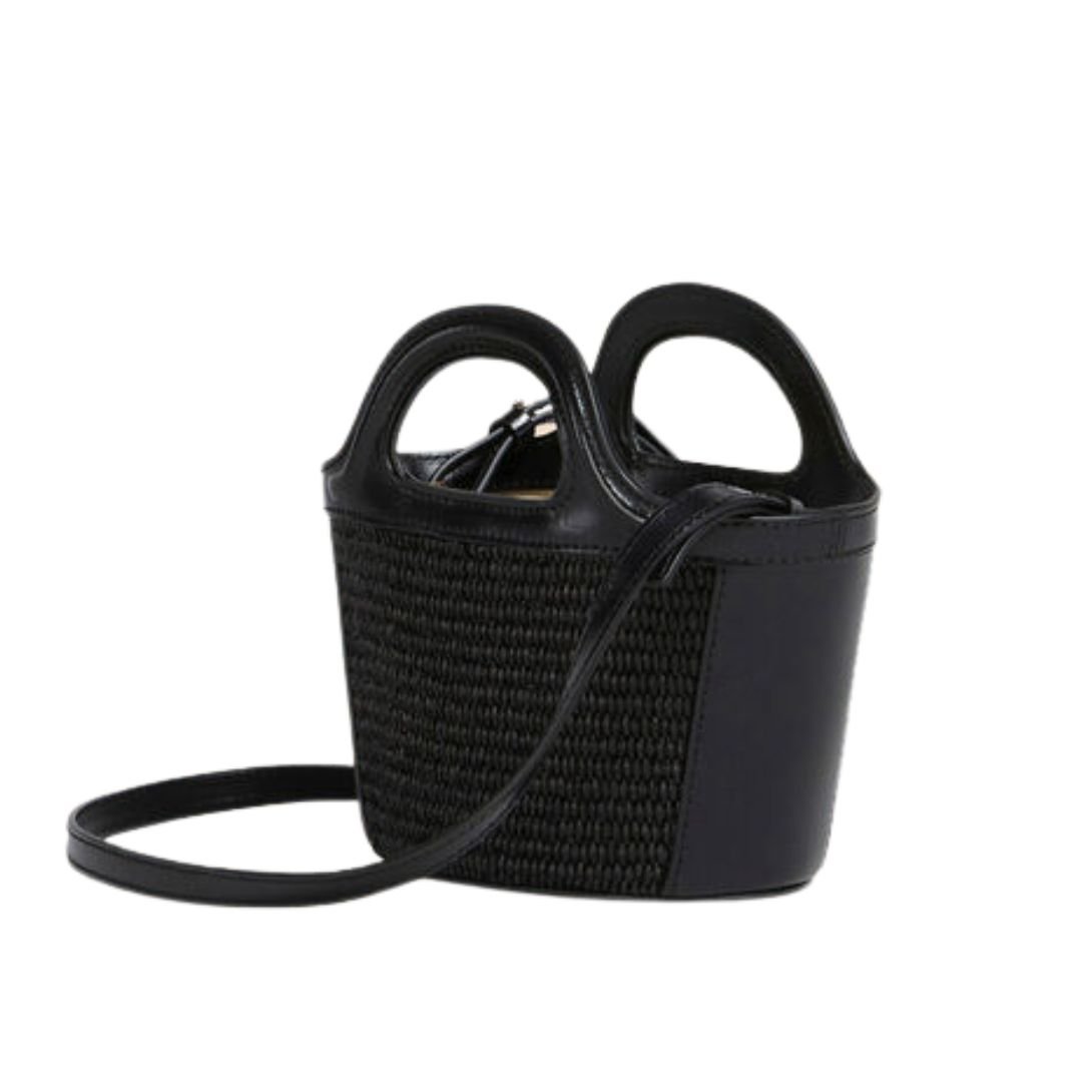 The Tropicalia Micro Bag by Marni combines playful charm with refined craftsmanship in a compact, statement-making silhouette. Expertly crafted in Italy, it features raffia-effect fabric panels paired with luxurious calf leather trims, offering a perfect blend of texture and sophistication.