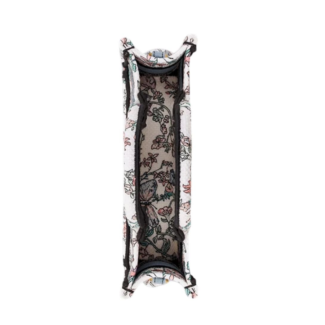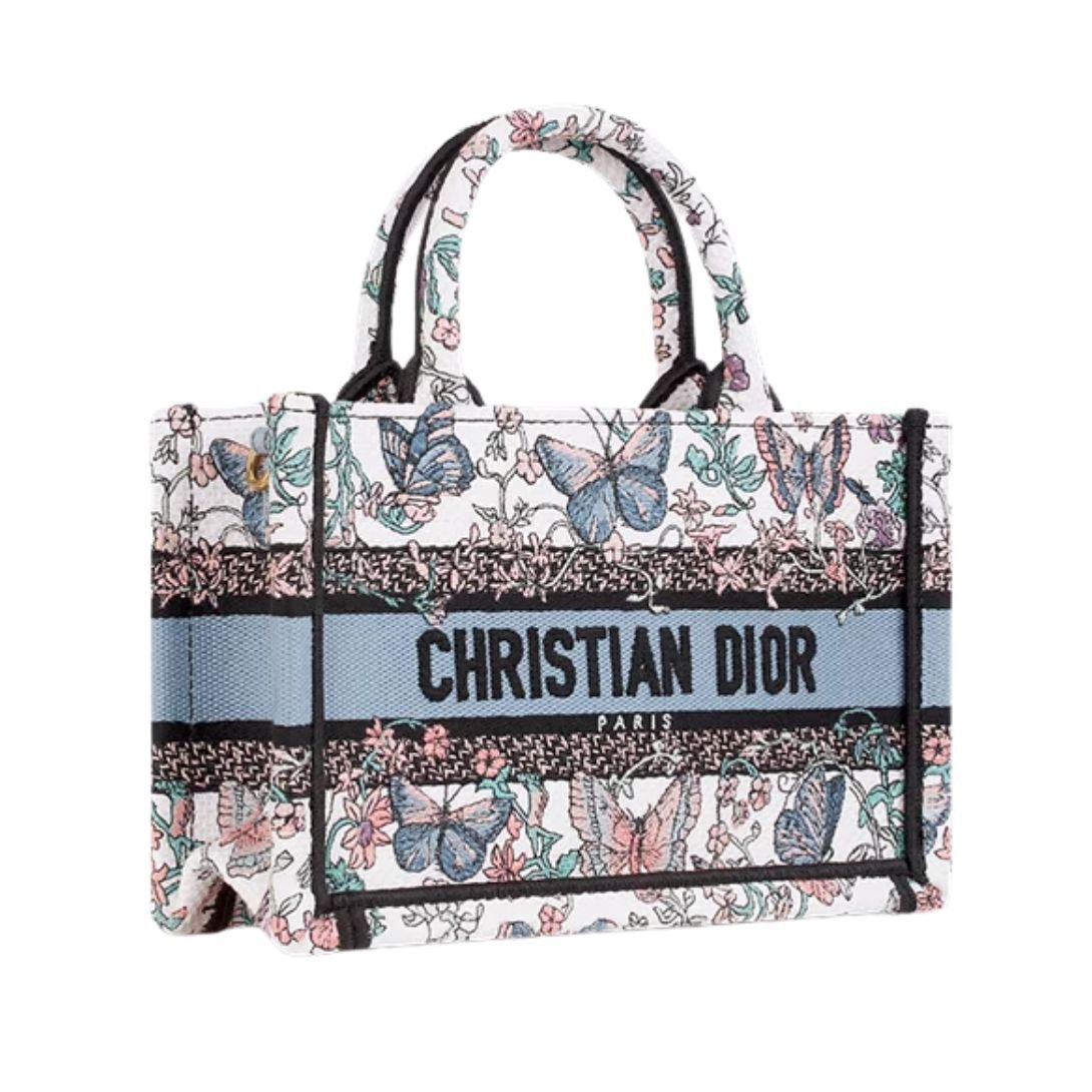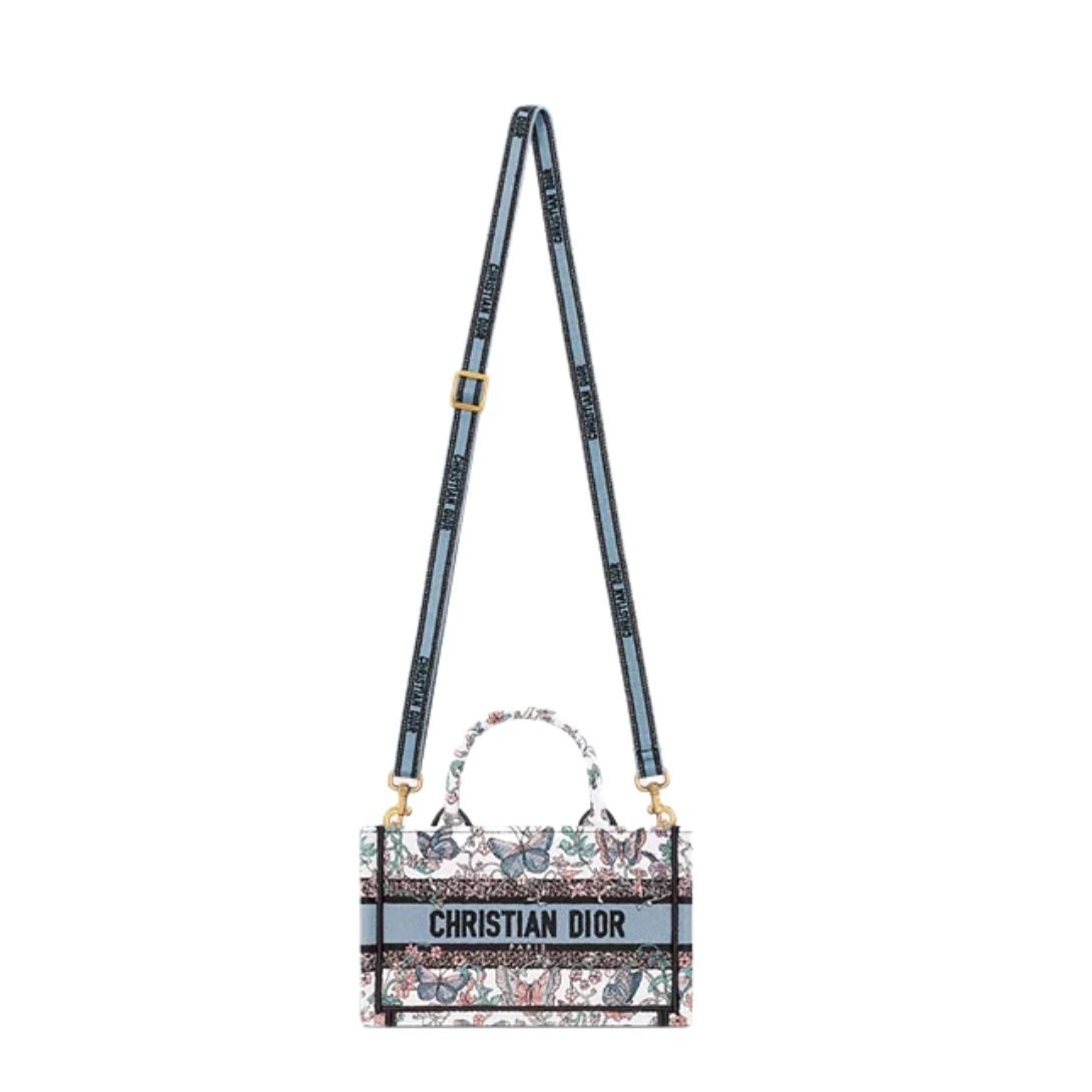 A refined reinterpretation of the House classic, the Mini Dior Book Tote was designed by Maria Grazia Chiuri, Creative Director of Christian Dior. This exquisite white tote is fully embroidered with Pietro Ruffo’s enchanting multicolor Toile de Jouy Papillon motif, featuring delicate butterflies woven into a poetic and dreamlike floral landscape.