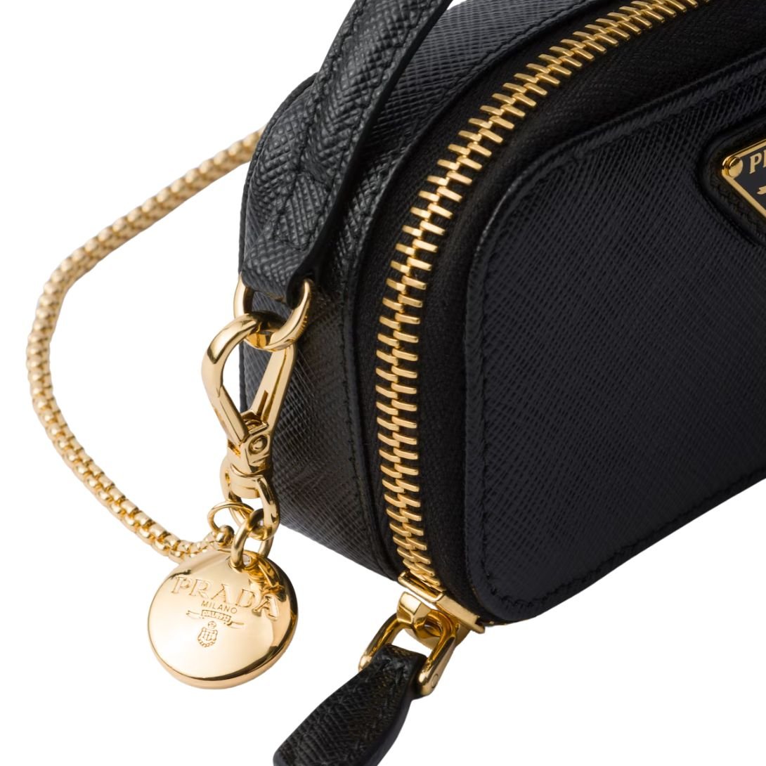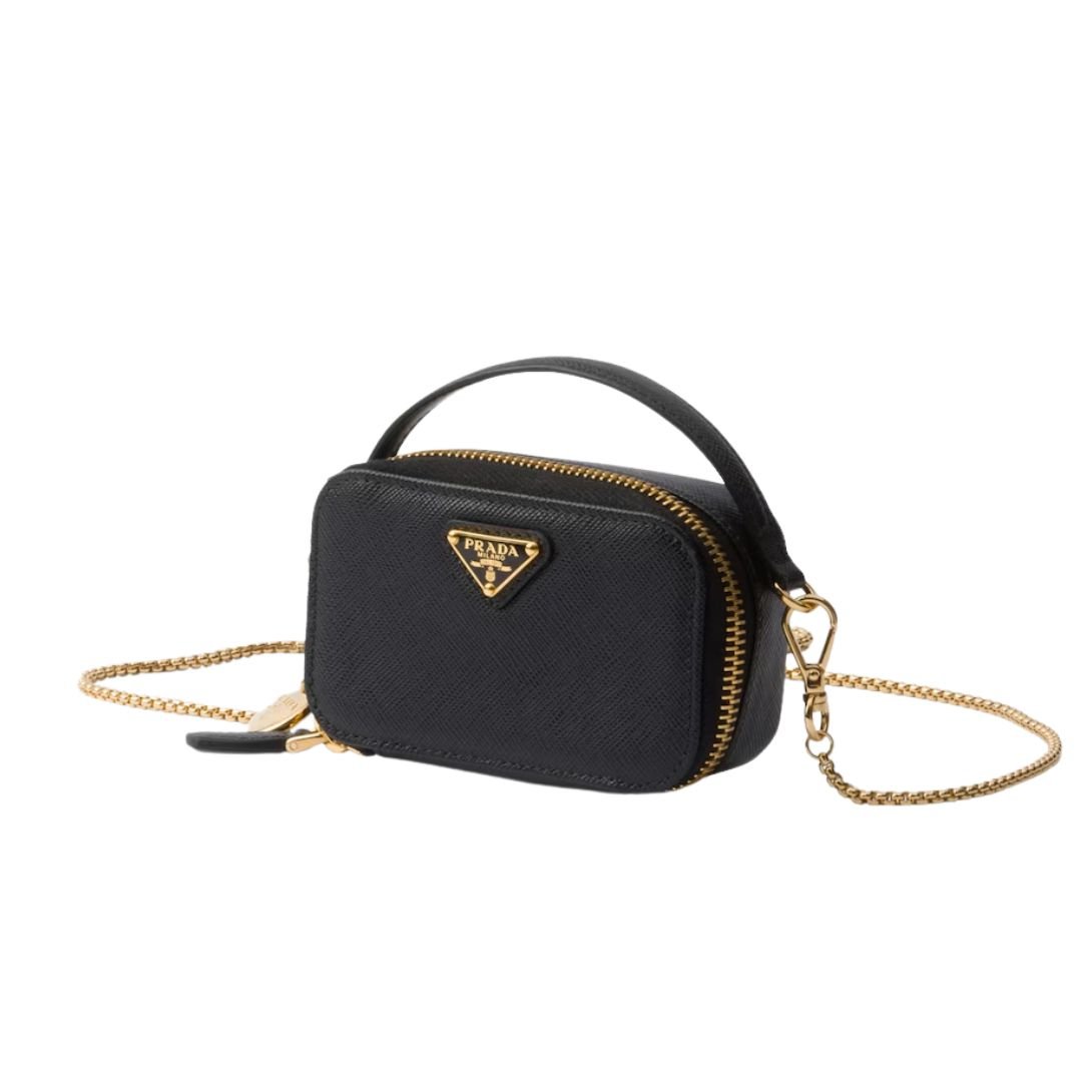 Defined by minimalist elegance and luxurious detail, the Prada Mini-Pouch is crafted from iconic Saffiano leather—renowned for its crosshatch texture and waxed finish. Compact in size but rich in sophistication, this sleek pouch features a smooth leather handle and a removable chain shoulder strap, offering multiple styling options. Finished with the enameled metal triangle logo and a logo-print nylon lining, it’s the perfect hands-free essential for carrying your smallest valuables in timeless Prada style.