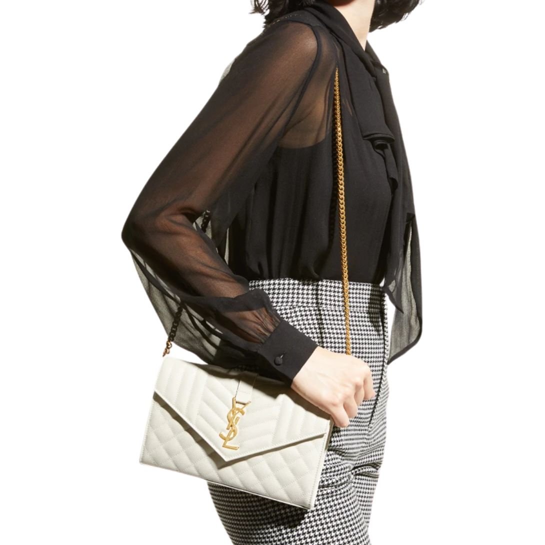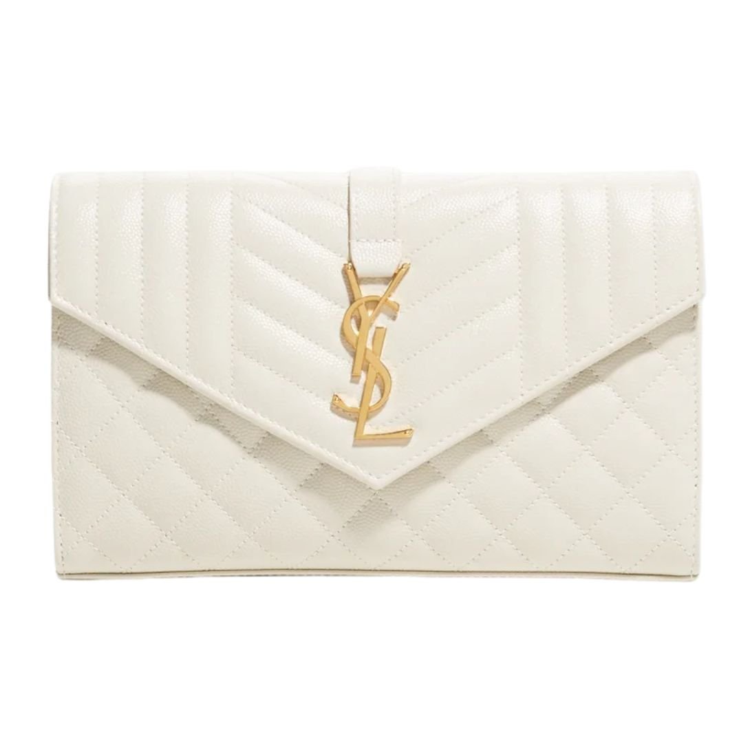 WOMEN’S SAINT LAURENT ENVELOPE TRIQUILT YSL WALLET ON CHAIN IN GRAINED LEATHER WHITE