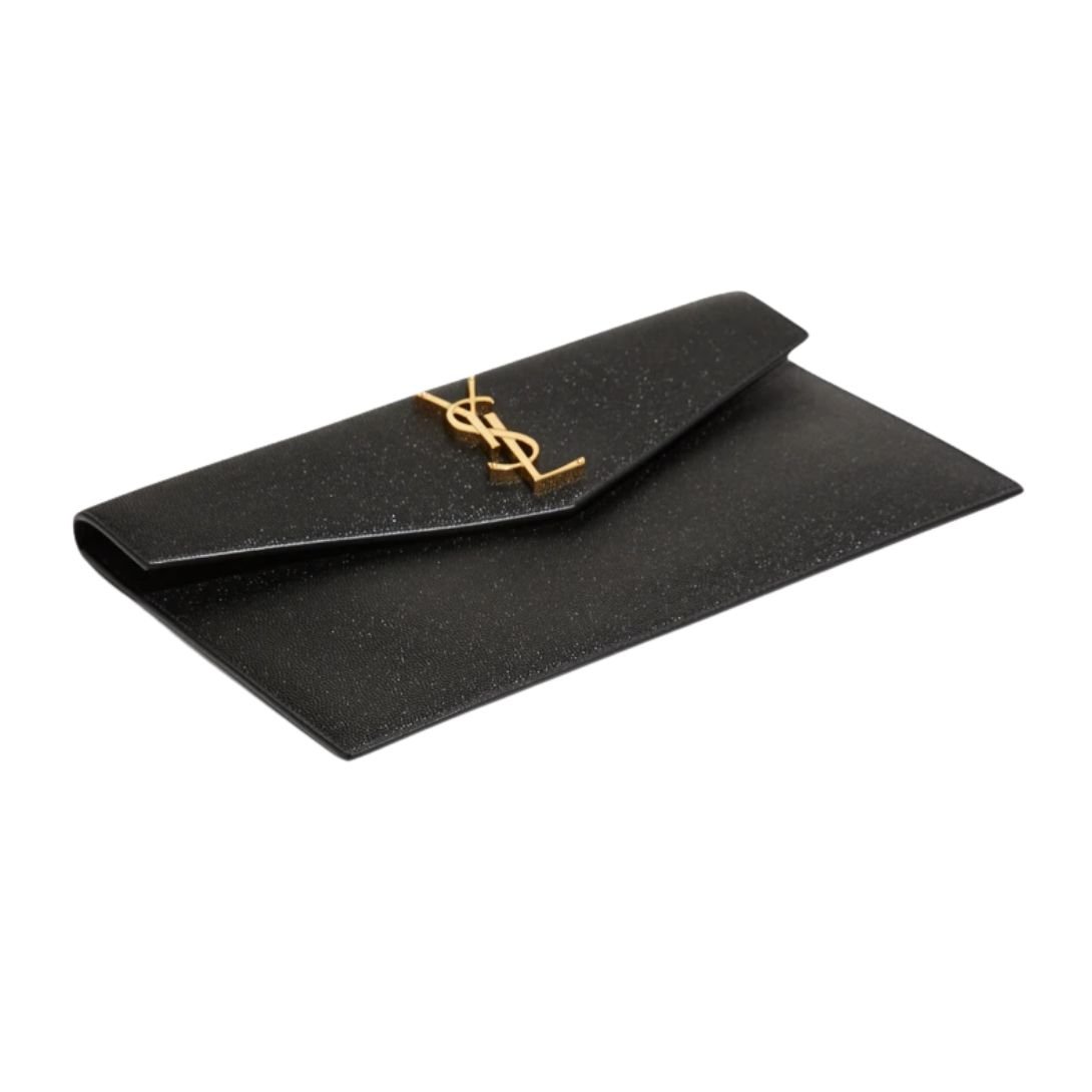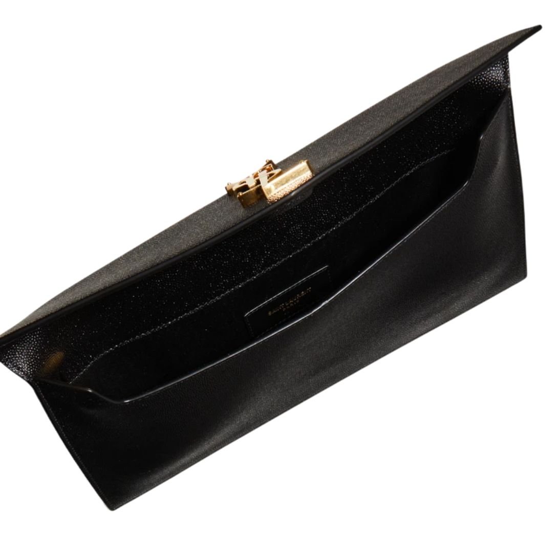 The structured envelope flap features a discreet magnetic closure, ensuring secure access while maintaining a streamlined look. At the center, the iconic metal YSL monogram adds a polished focal point.